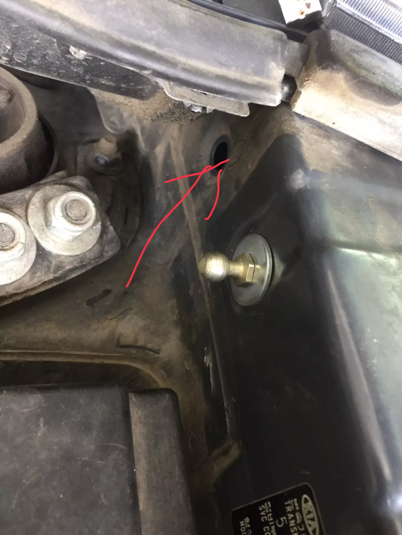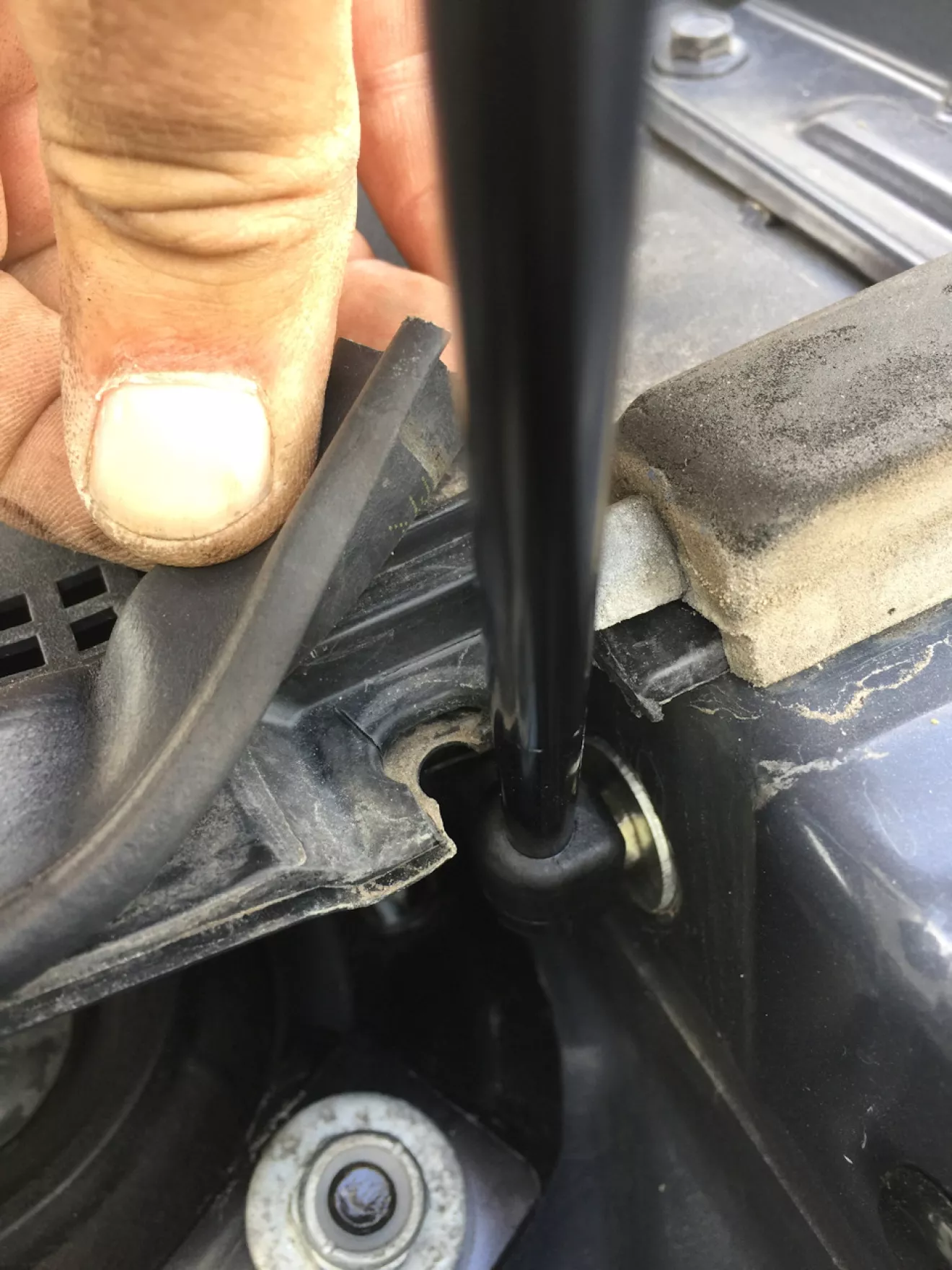 Второй конец упора на заклепки к капоту чуть под углом как раз между воздуховодом и фарой проходит.