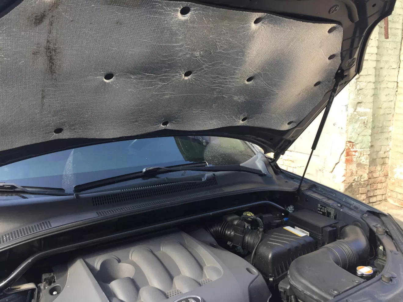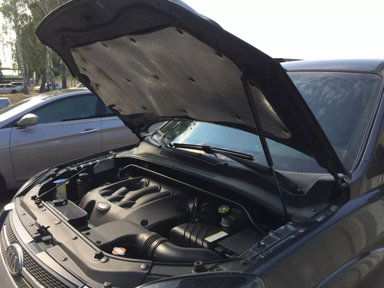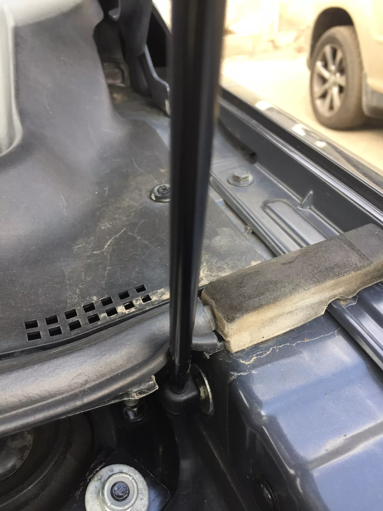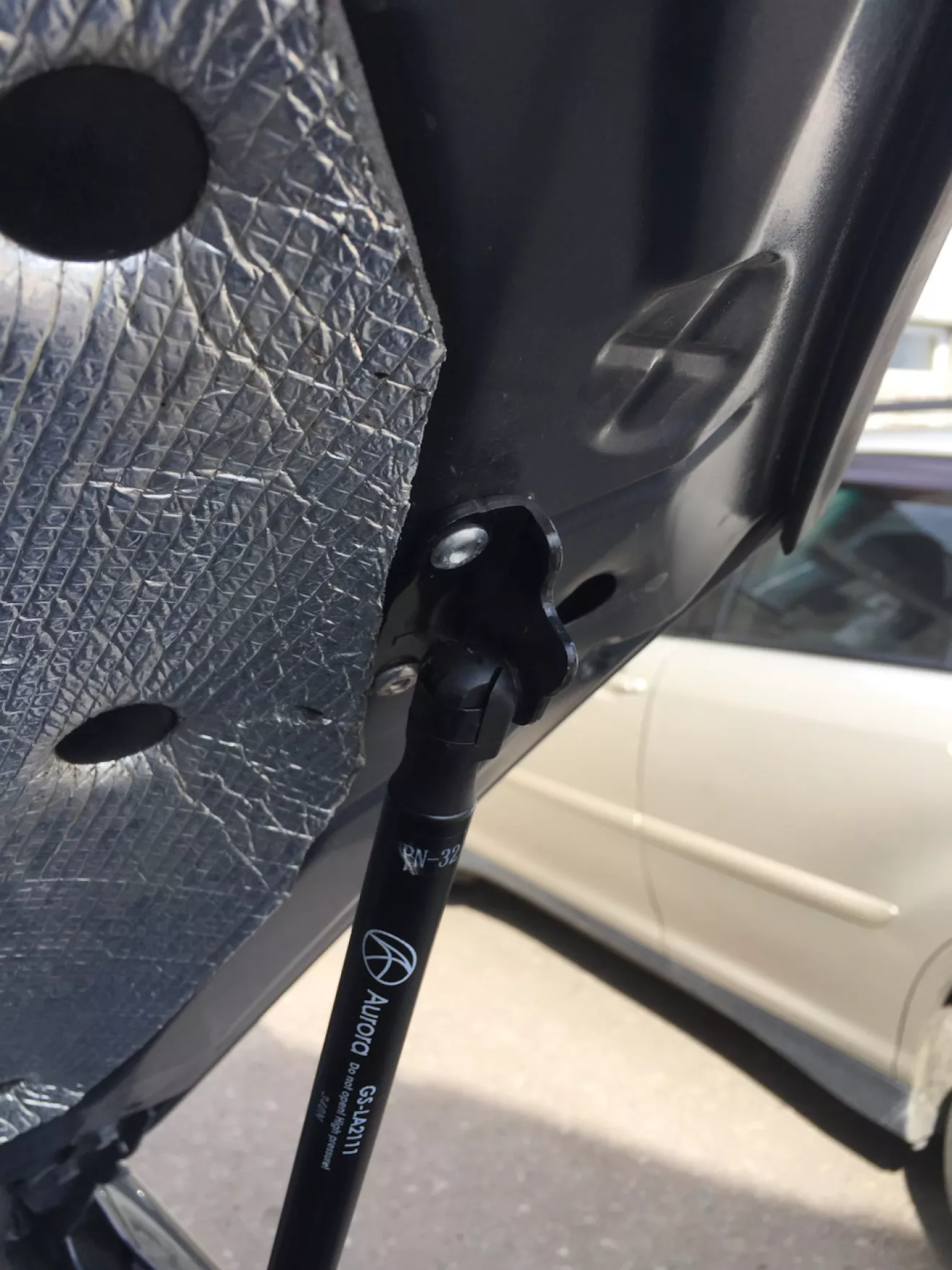 Захотелось установить газовый упор капота. Долго мыслил, примерял и вот, что получилось. В начале примерялся к упору задней двери. Заказал на разборке один упор и он был с кронштейном. Первым местом выбрал отверстие слева ближе к передку, но расстояние было маловато, решил перенести подальше