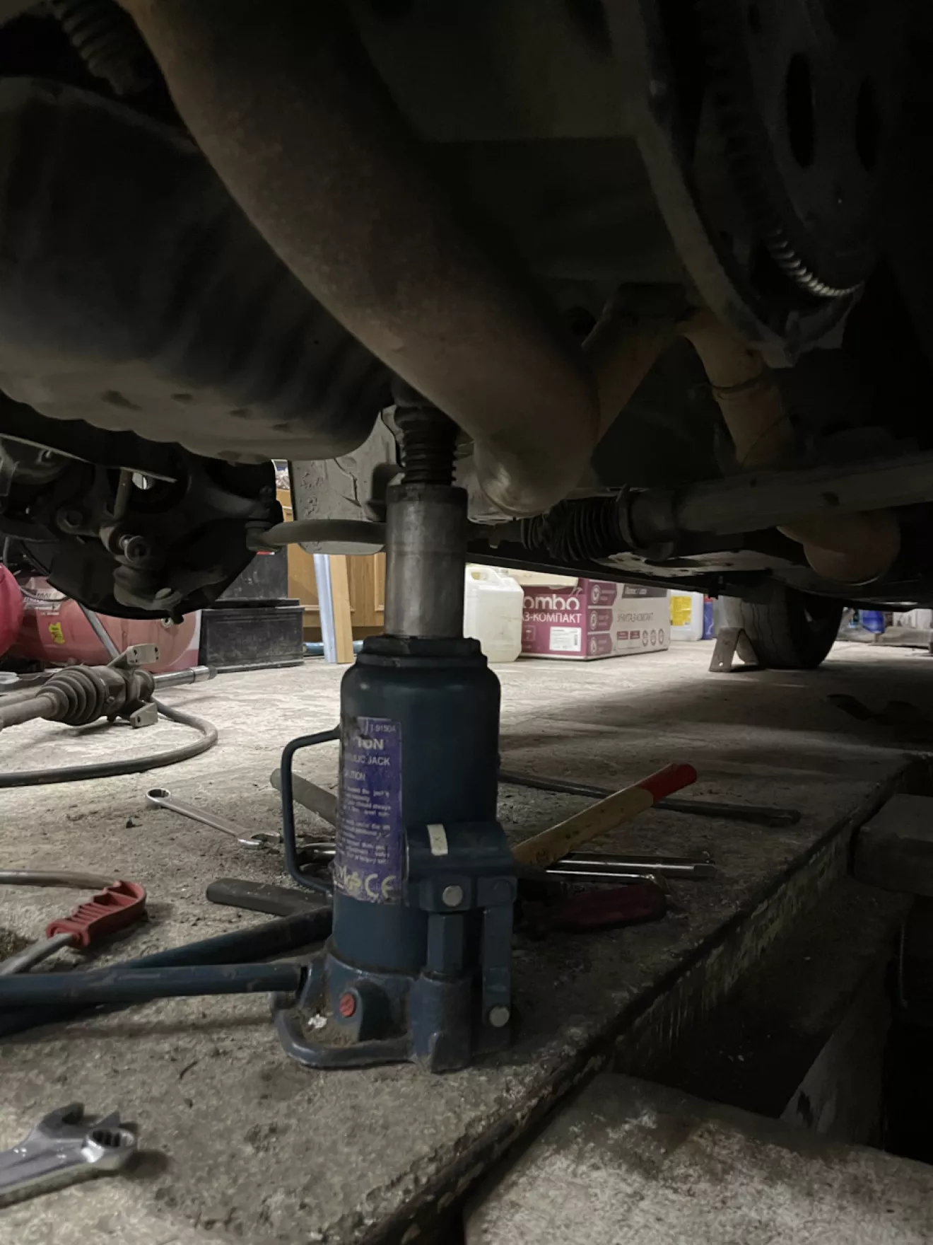 Поддамкратив двигатель снизу гидро-домкратом, я начал откручивать колокол коробки и подушки которые мешают снятию + нужно открутить карданный вал с подвесным подшипником, предварительно накернить его положение на раздаточной коробке: подвязали кардан, чтоб не мешал.