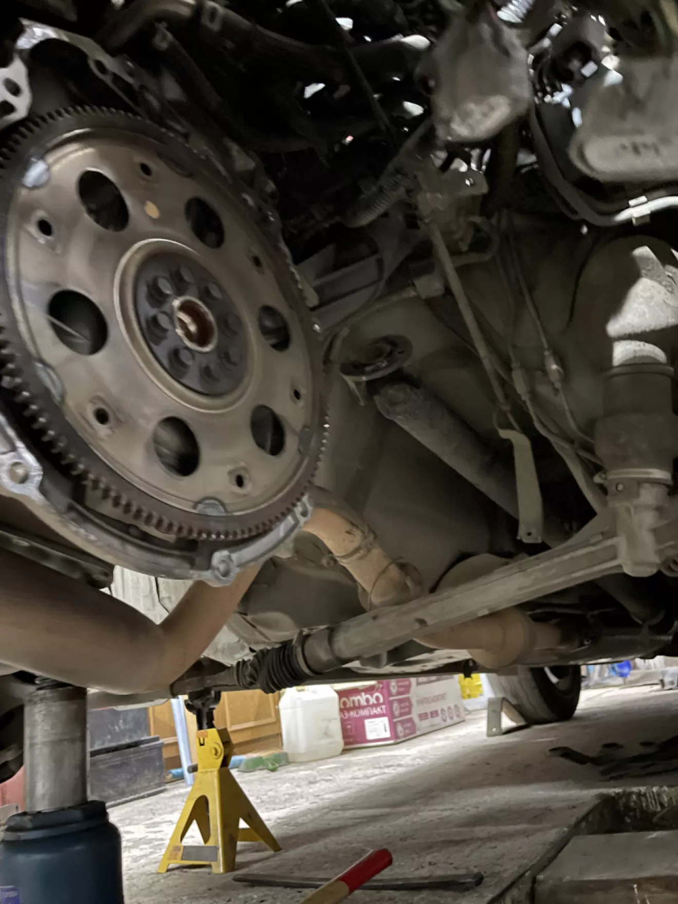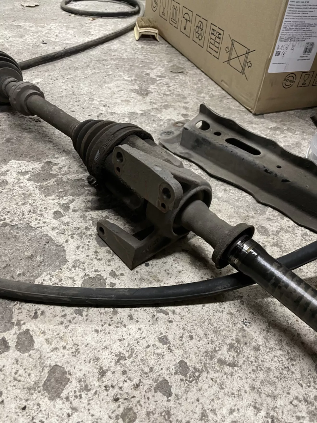 Когда открутили все болты, а их там очень как много, и болты подушек- кстате они могут быть надорванными как у меня, лучше сразу заказать новые. Пытаемся отодвинуть коробку от двигателя ( нужно как минимум два мужика, потому как вес коробки внушительный! ), — вынимаем правый привод, отодвинув корпус промежуточного подшипника от двигателя.