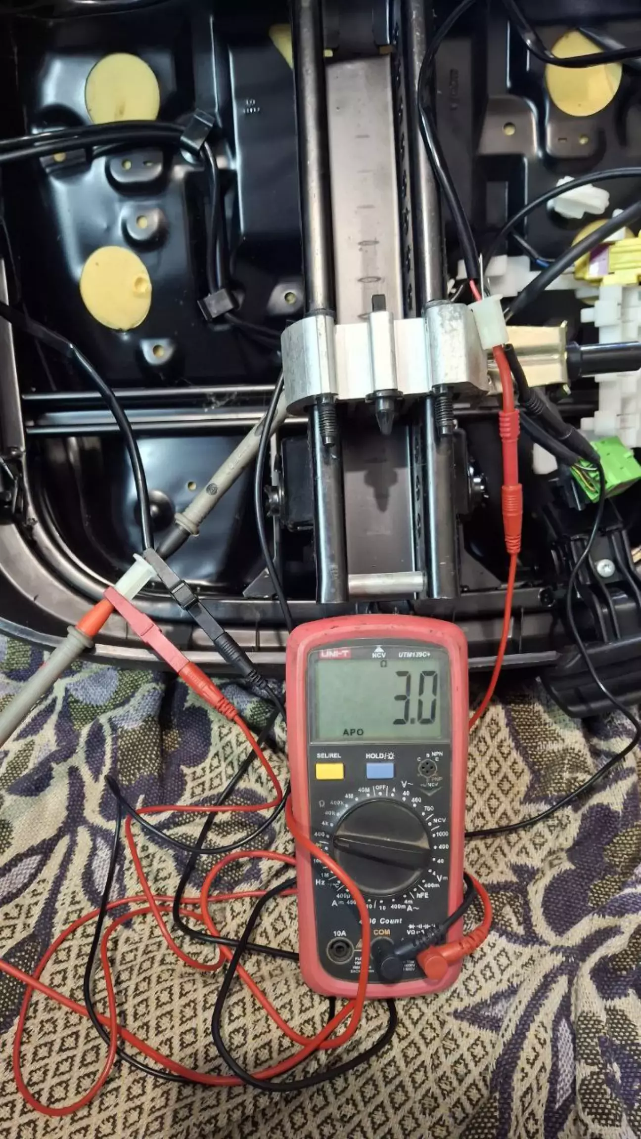 Виміряв опір одного елементу, він склав 6 Ом, уже стало ясно, що про послідовне підключення чи заміну лише мату сидіння можна забути. Щоб отримати наближений опір до оригінального потрібно підключити два нові елементи паралельно один одному.