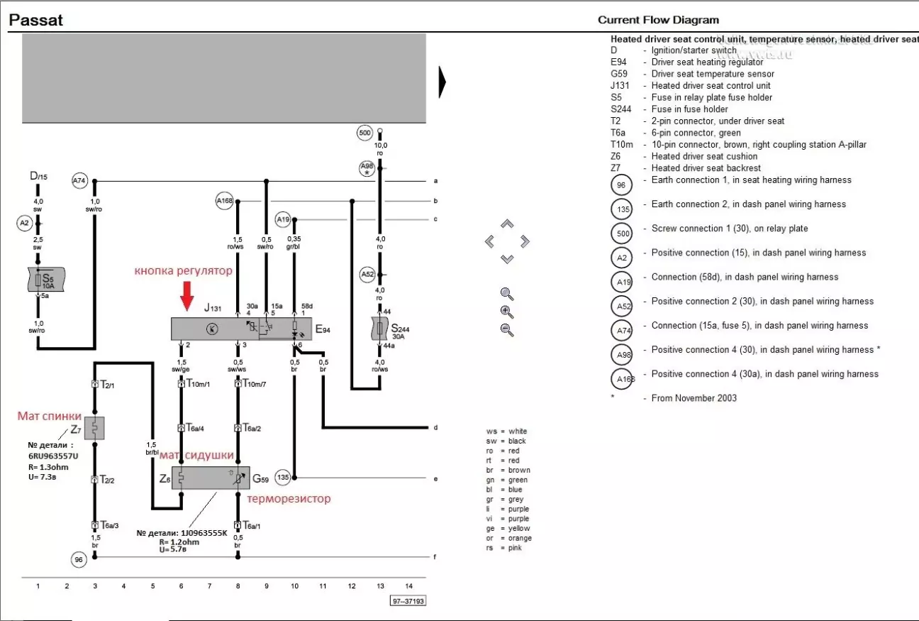 З неї зрозуміло принцип підключення оригінальних елементів, а також їх характеристики: Сидіння має опір - 1.2 Ом, спинка має опір - 1.3 Ом, підключення послідовне тому опір сумується = 2.5 Ом опір на оригінальних елементів. Саме цей опір має вимірюватись на роз'ємі під сидінням.