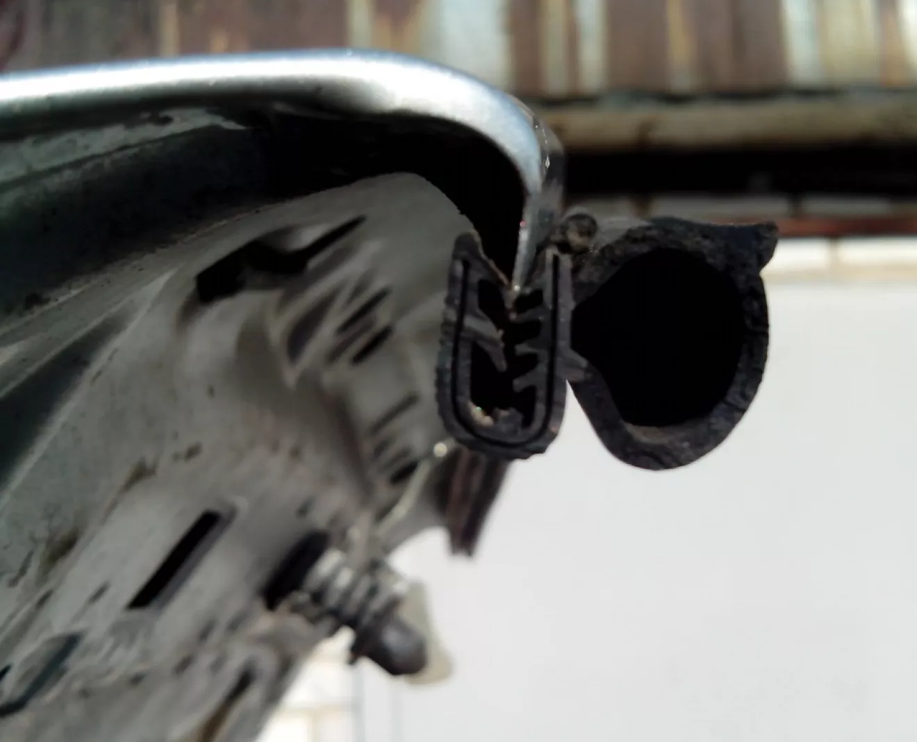 На авторынке был куплен полутораметровый кусок уплотнителя. Работа по замене заняла 5 минут. Из инструмента понадобился только нож. Металлическая полоса в уплотнителе не цельная, а состоит из маленьких кусочков металла изогнутых в форме U и соединенных между собой узкой полоской металла, которая легко обламывается.