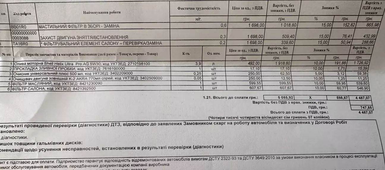 Авто проїхало уже близько 11тис.км. після попереднього ТО і вирішив замінити оливу. Хоч експлуатація в основному по трасі, але авто не молоде, уже краще частіше трохи міняти) Ну і крім оливи ще поставили свіжий фільтр салону, звик на всіх авто приблизно 2 рази в рік міняти. Вартість ТО у офіціалів на фото нижче. Можливо наступного разу закуплю сам запчастини для ТО і поїду в якийсь hunters garage чи тп, але суттєвої економії все рівно не буде.