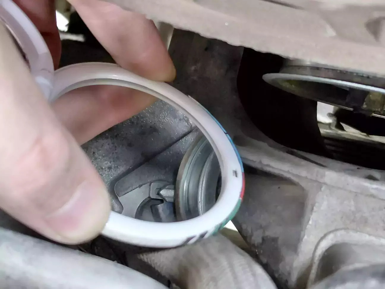 На корпусе ролика имеется специальное прямоугольное отверстие и флажок который двигается по мере натяжения пружины. В положении нормального натяжения ремня подвижный флажок должен находится напротив отверстия на корпусе ролика.
