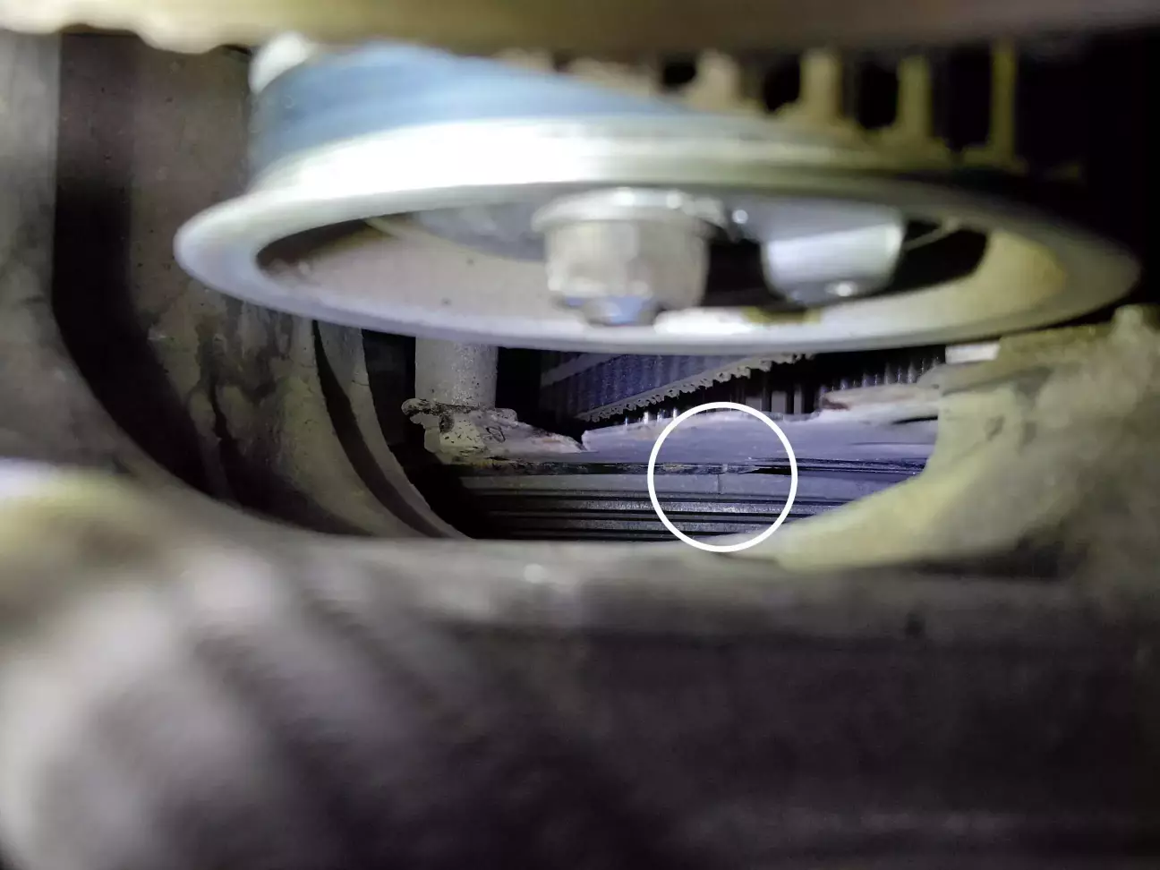 С распредвалом всё просто. Теперь нужно убедиться что коленвал также находится в ВМТ по меткам. Для этого можно при снятом переднем правом колесе и с помощью зеркала или камеры телефона увидеть метки на шкиве коленвала и нижней стальной крышке ремня ГРМ. Или же подсветив фонариком увидеть метки через моторный отсек.