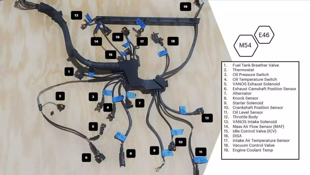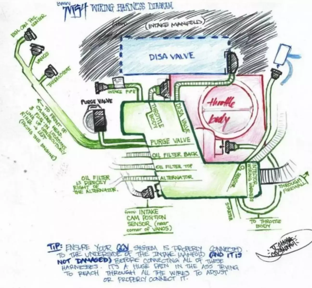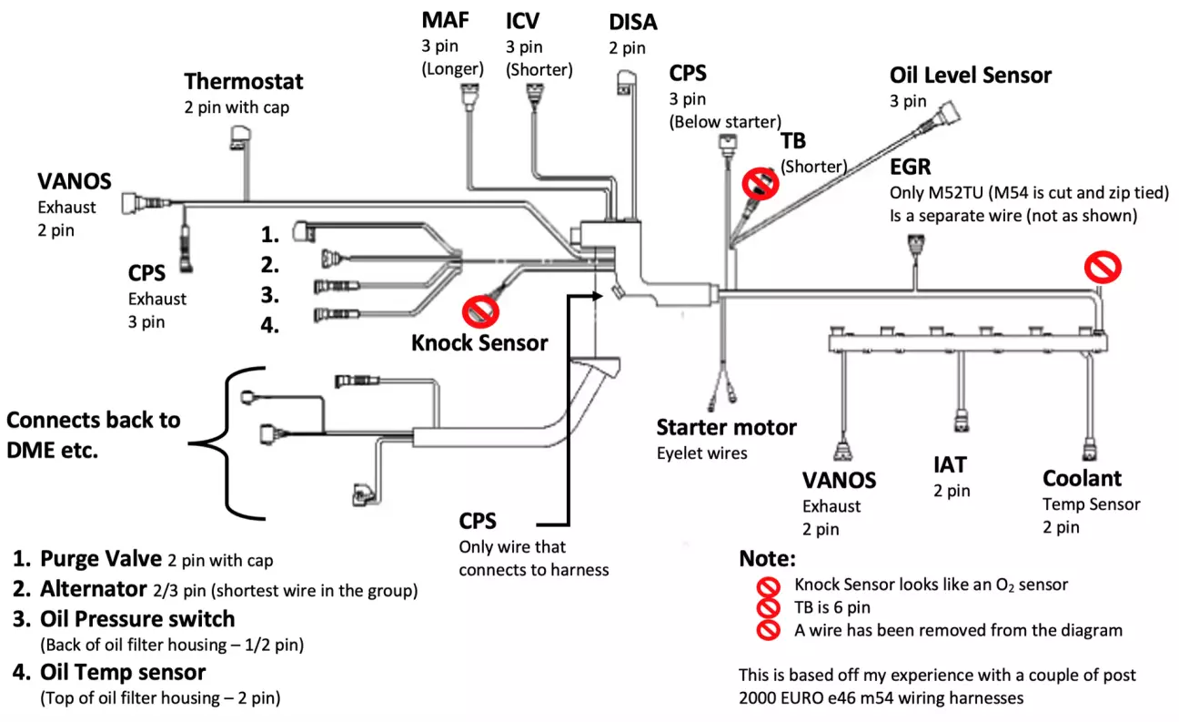 При зборці мотору і підключенні всіх датчиків, користувалися схемами, які можна знайти в мережі. Лишу тут, може знадобиться. Стосується мотору м54b30 для е46 на МКПП.