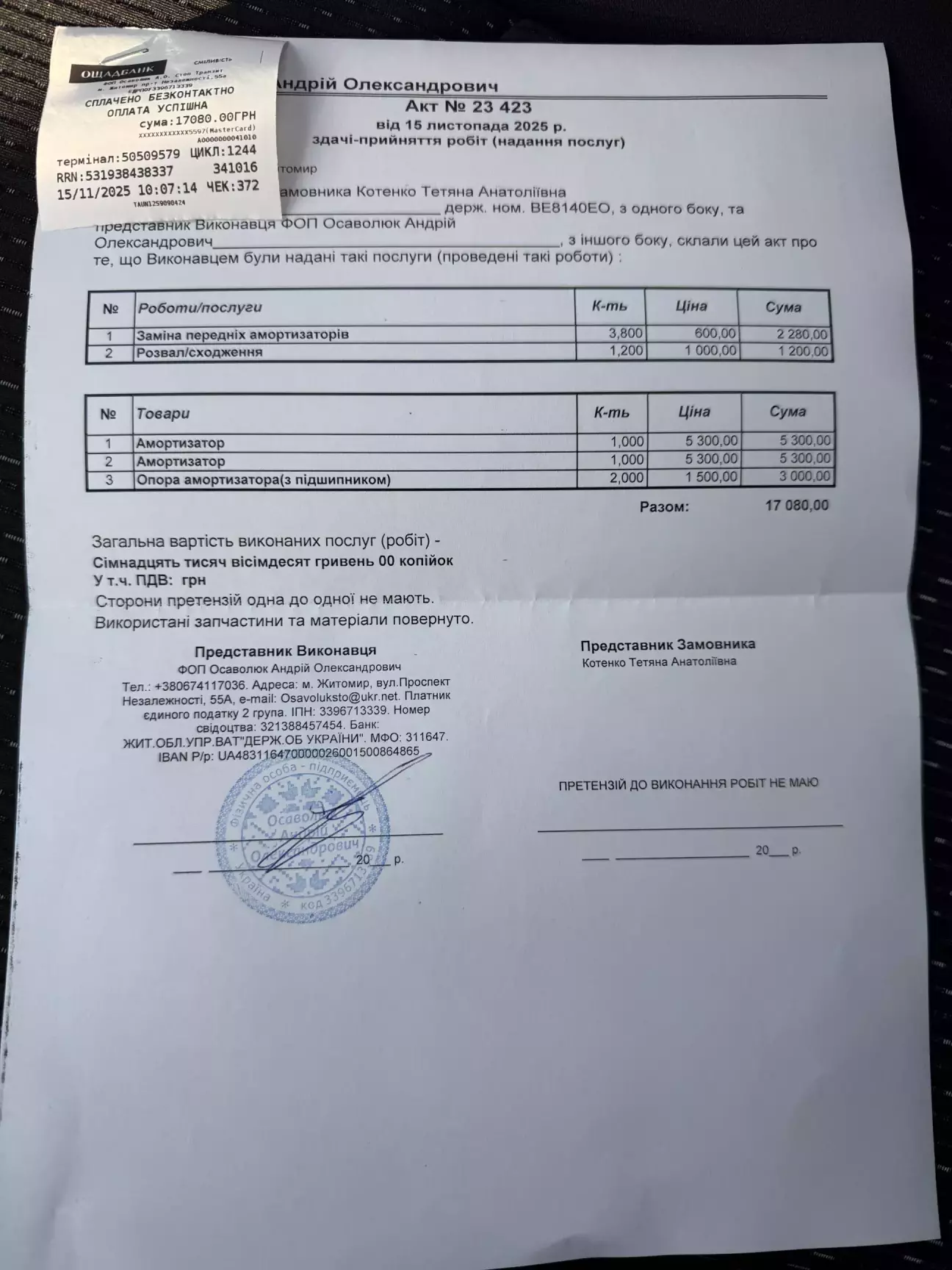 Всім привіт, ще при придбанні авто з правої сторони десь щось підстукувало, декілька разів була на діагностиці і вібростенді, причина була виявлена, передній правий аморт не потік але в середини були виявлені сторонні звуки. Після чергової діагностики ходової було прийнято рішення нарешті все ще раз передивитись і замінити необхідне. Тому зробили огляд, замовили запчастини і через тиждень загнав Умку на заміну. Декілька годин і все готово, насолоджуюсь тишею. Всім миру та спокою!