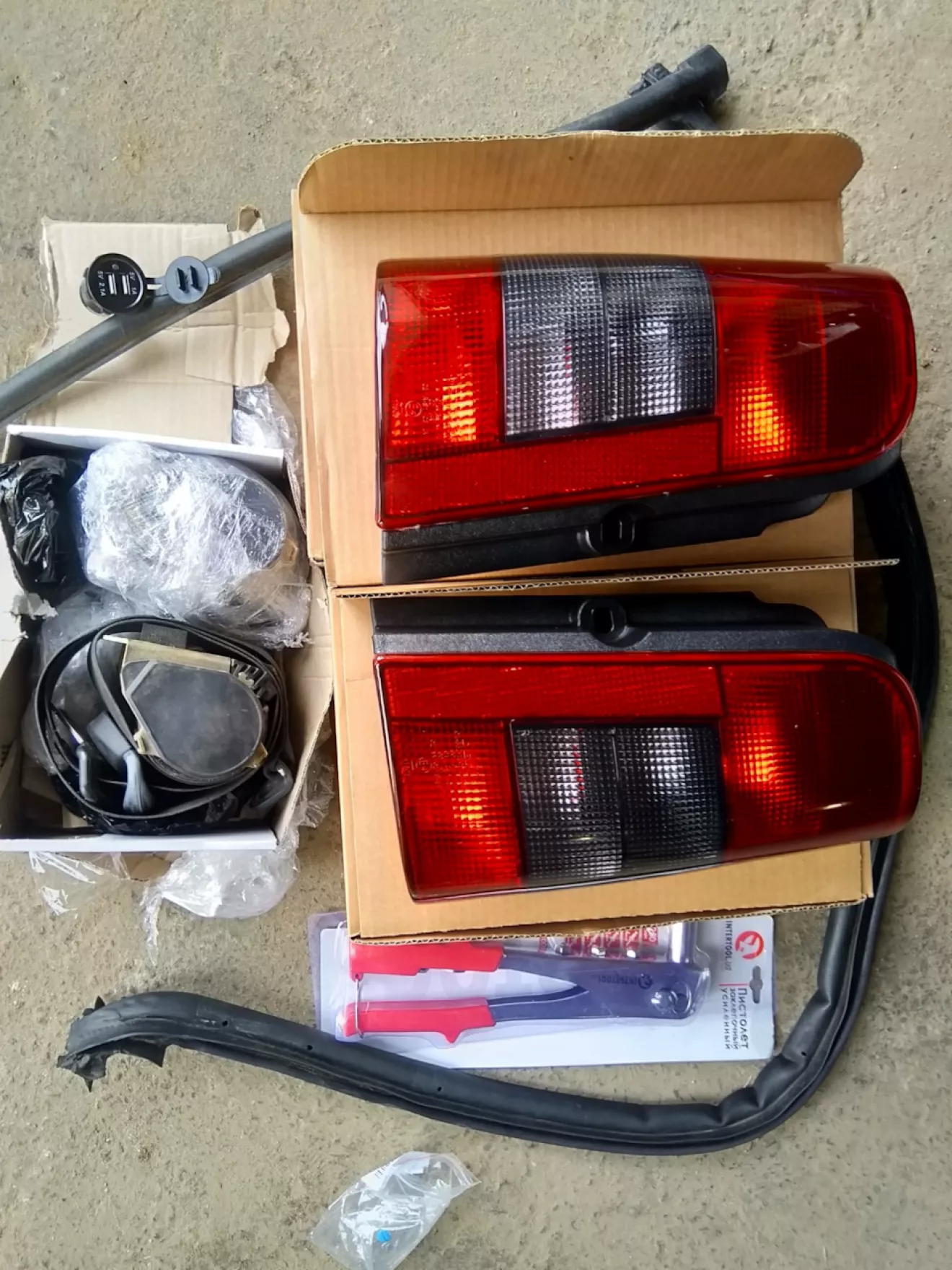 , заклепочник для работ, ремни безопасности и с Али приехал один из заказанных юсб зарядок.