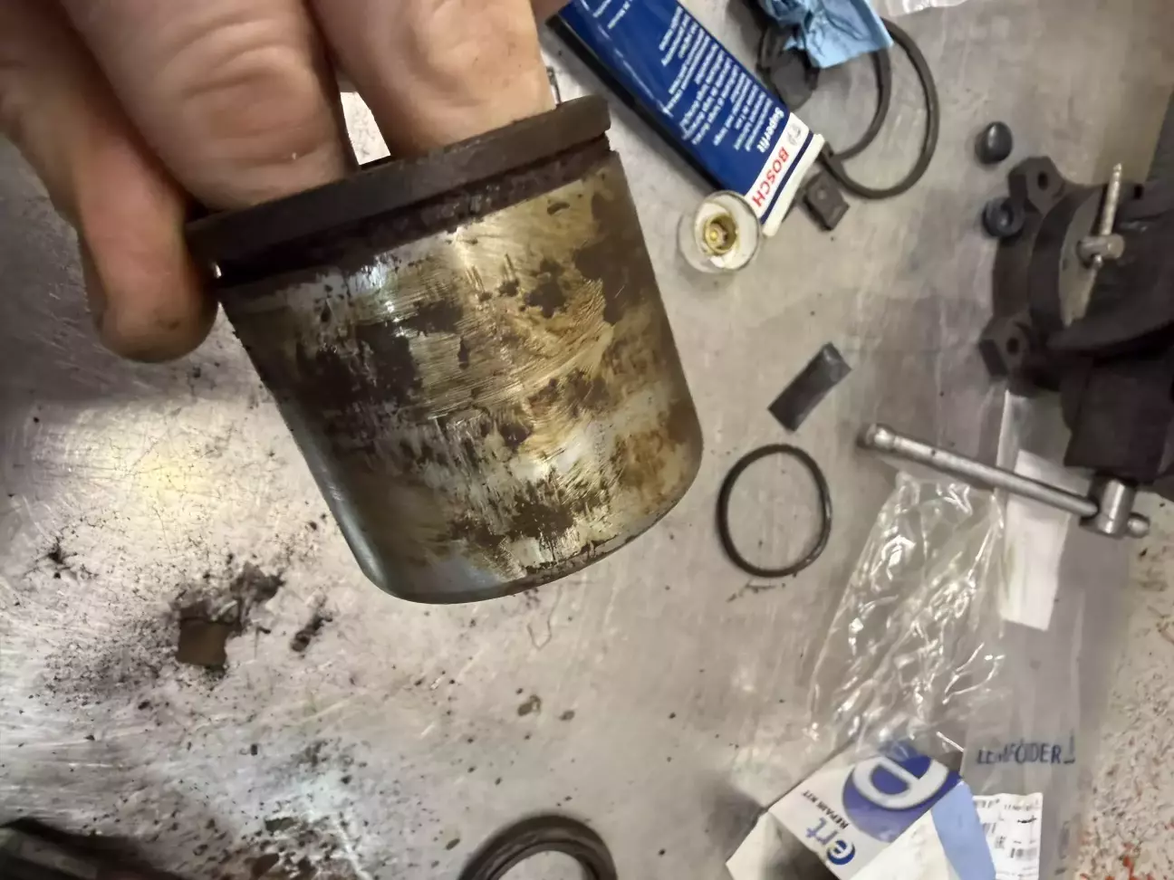 під пильничок і пшикаю силіконкою, проганяю поршень туди сюди, щоб все відходило як потрібно. Проводивши таку процедуру заглянув на своїй і знайшов неприємність спереду праворуч у вигляді іржіі на поршні. Звісно ж замовляю два комплекти пильників Quick Brake по 120-150грн (на всякий бо можна легко угандонить) і поршень ERT 280грн і пів літри гальмівної Мотюль Дот5.1. Переборка супорта