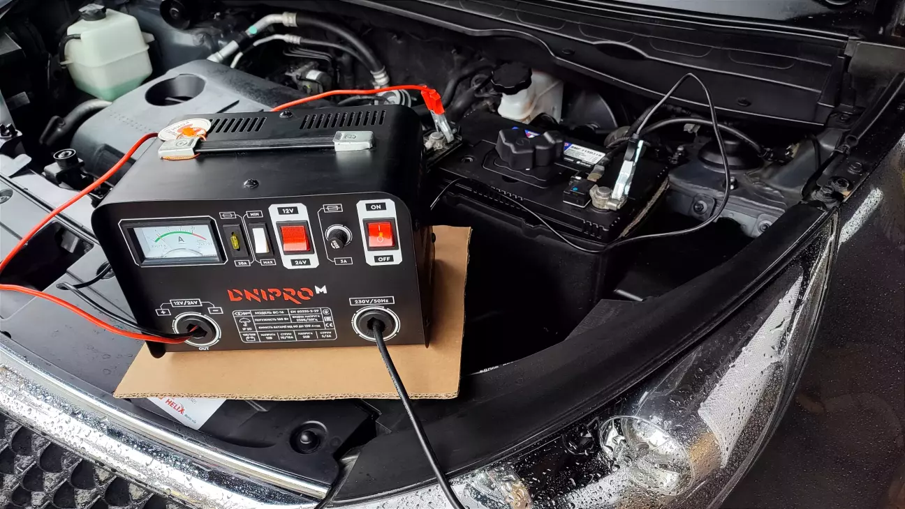 Заряджався лише на мінімальному струмі й під контролем, бо цей DNIPRO-М простий трансформаторний зарядник без автоматики. Оптимально безпечний струм 5–7 A.