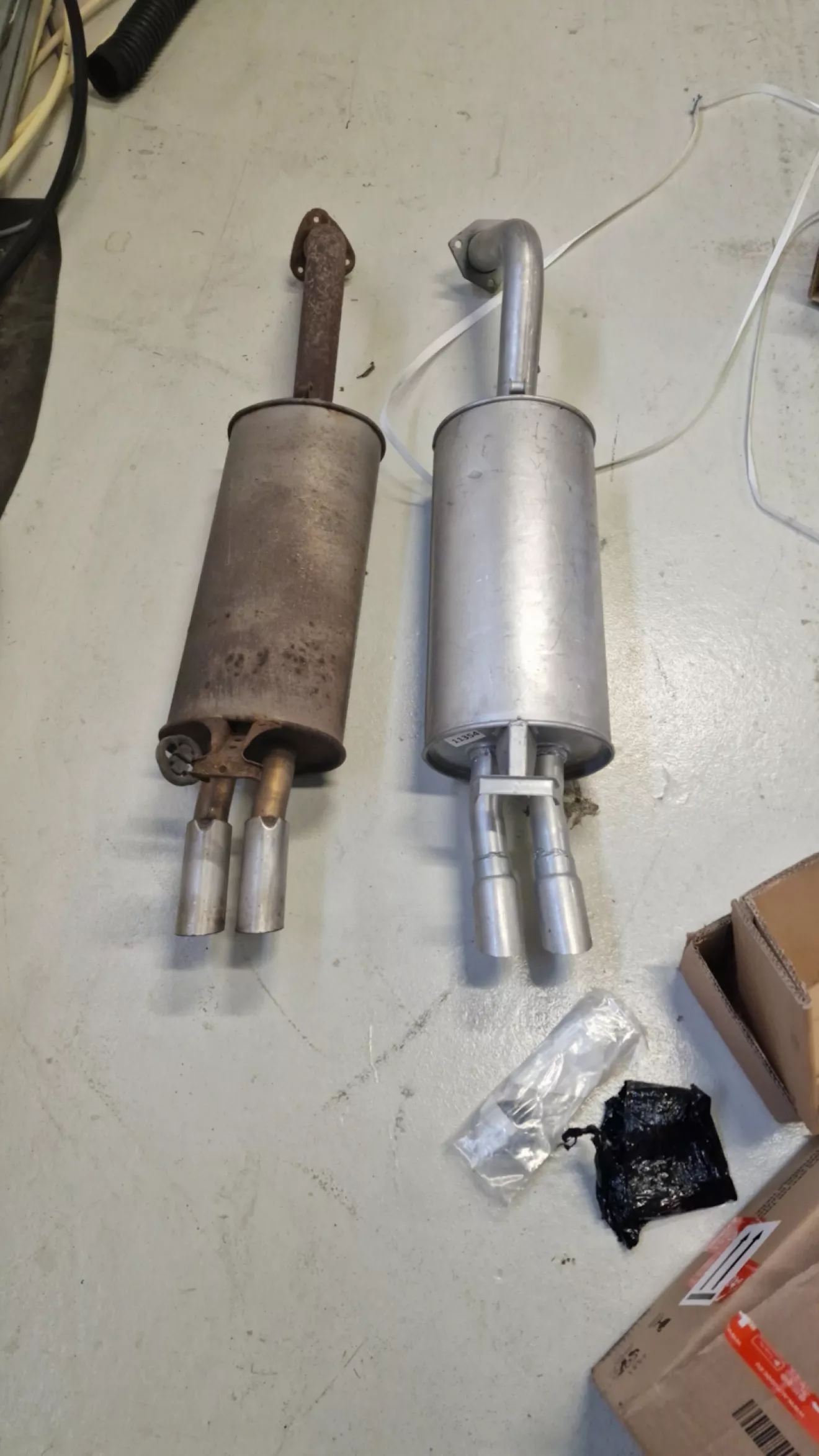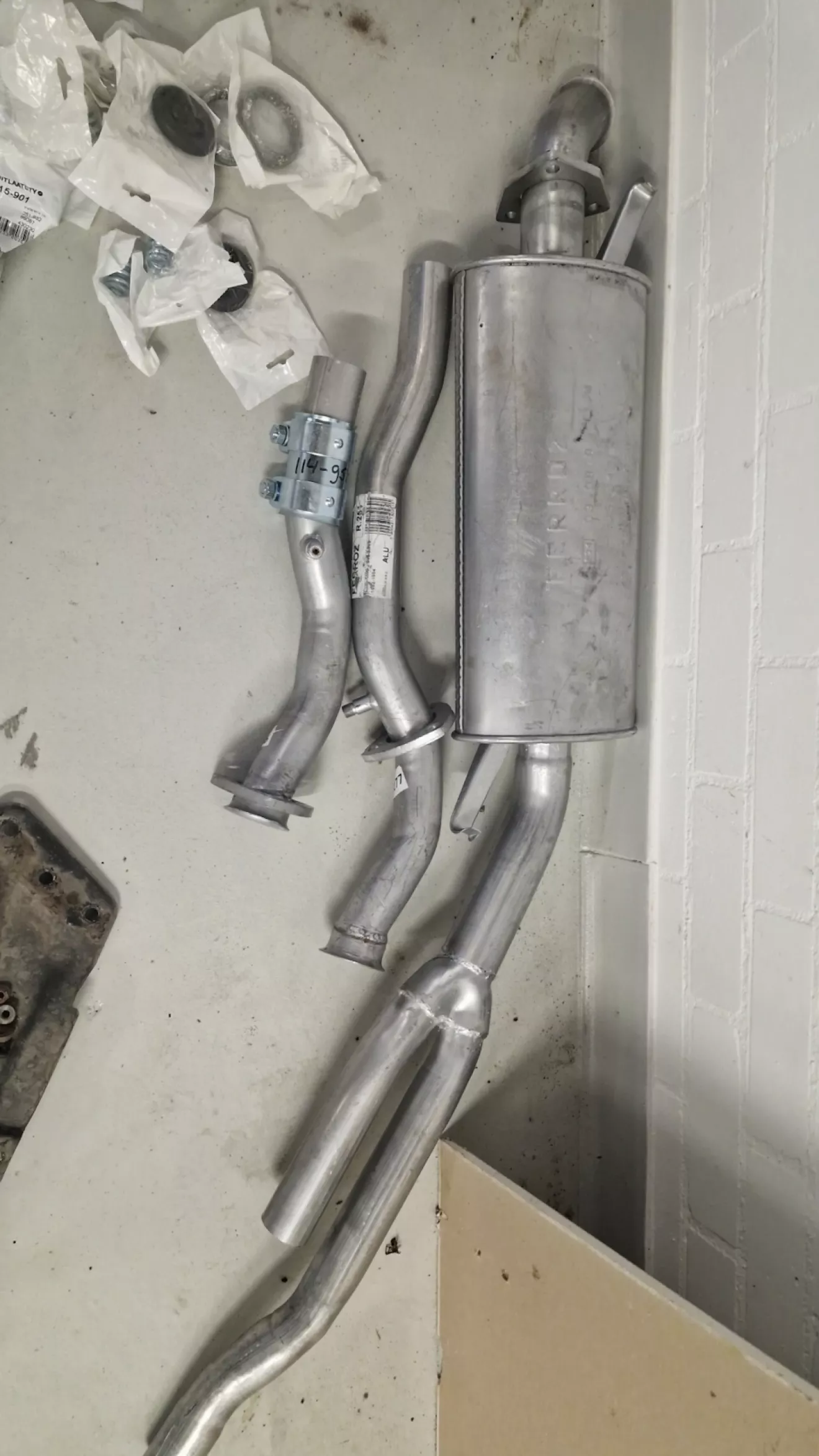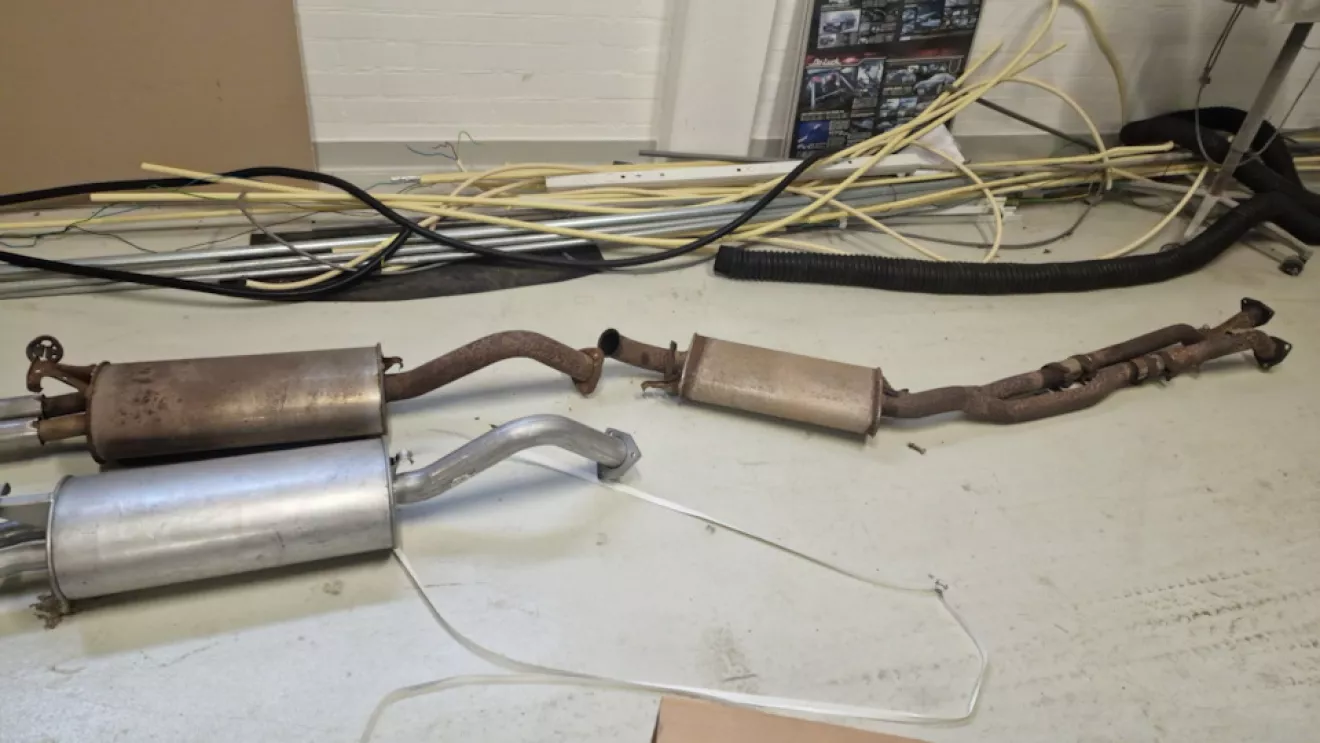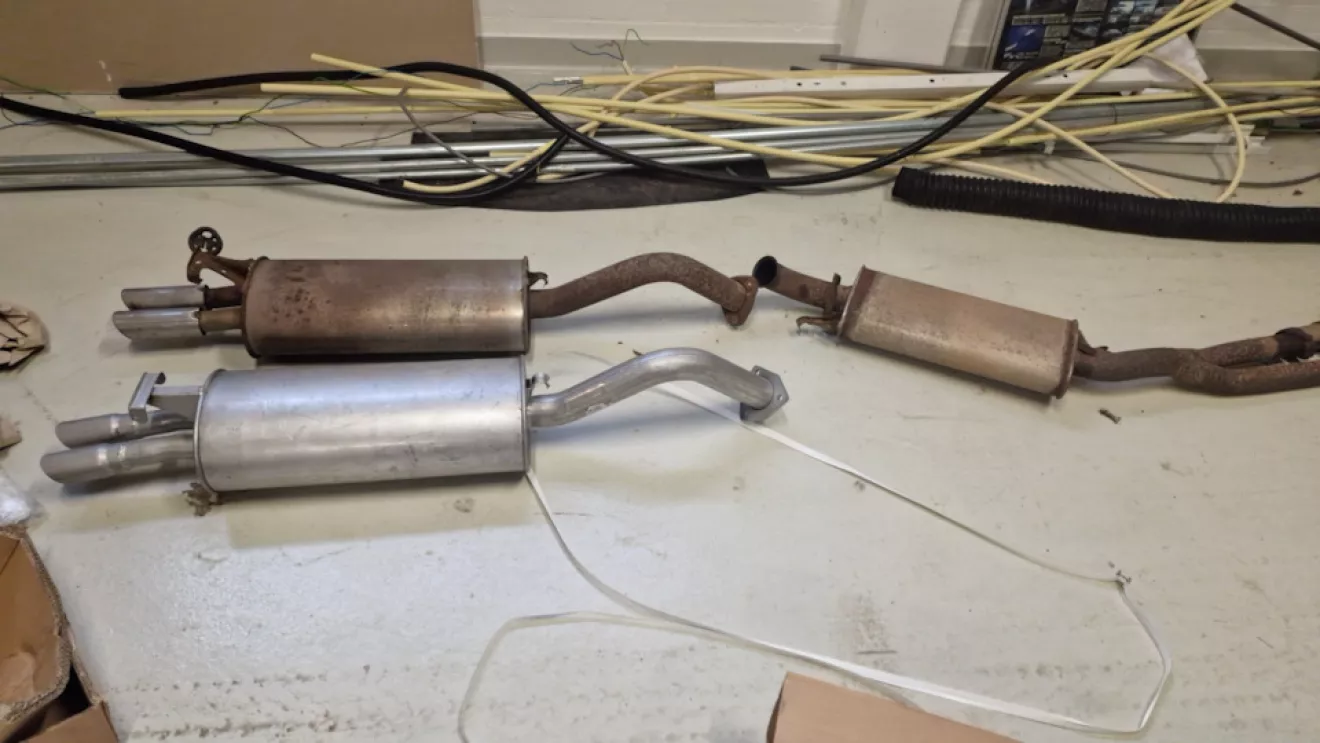 Вот и пришла новая выхлопная, добраться этого были заменены и установлены новые катализаторы, теперь и вся новая выхлопная система. А вместе с ними новые лямбда два, Помпа фирмы Hepu, Термостат и свечи. Проблема была с установкой выхлопной т.к. трудно все подогнать, и лямбды отказались откручиваться, пришлось их ломать и накидывать головку на 22 длинную. Был шум не понятный по мере прогрева двигателя, грешил на помпу, но оказалась не Помпа, так что есть почти новая Помпа в запасе… ещё пришли прокладки головок и сальники распредвала, но не успел поменять! Следующее подушки все и новая рулевая рейка…