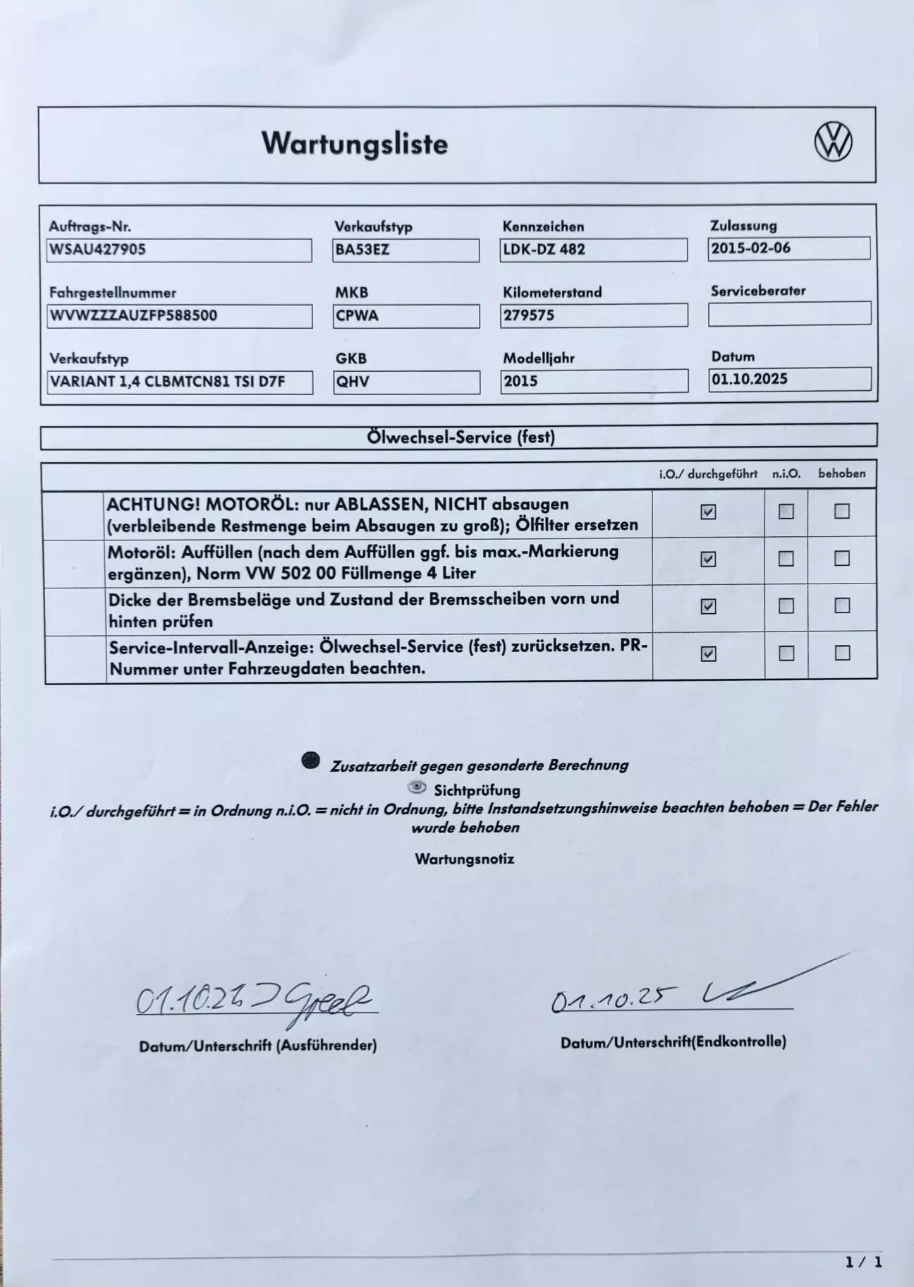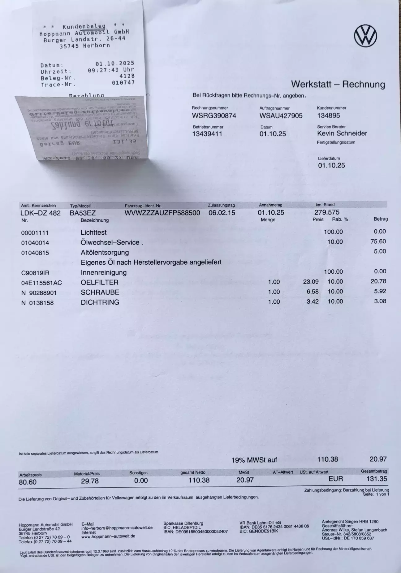 Минула заміна моторної оливи була рівно 6 місяців тому або на 263,5 т. км і за моїми підрахунками, 15 т. км від попередньої заміни оливи мали статися на початку жовтня, тому я заздалегіть записався до офіціалів на 1ше жовтня, як раз перед осінньою відпусткою. В принципі воно так би й сталося, якби я врахував, що дружина теж кожної суботи додає по 150 км + поїздка на південь Німеччини на концерт колеги-гітариста, якого я згадував у попередньому дописі, + незапаланована покатенька на зустріч з друзями, які їхали з України до Англії... Таким чином, на заброньоване число я приїхав на 1 т. км перекатаним інтервалом... Ок, все в моєму ненайкращому стилі... Все зробили, авто помили та пропилососили салон, з менеджера вибив знижку на кілька сервісних візитів, адже починаючи з найпершого мого візиту на сервіс мені (та й попередньому власнику) систематично приписували кожного разу по 3 гвинти, які тримають великий пильник двигуна, який з'явився на Гольфу лише кілька місяців тому. Тобто за даними сервісної системи ВАГ на Гольфу мав би стояти великий пильник, але на конвеєрі поставили малий (не дуже віриться, але й не можу виключити, що попередньому власнику не підмінили пильник під час одного з візитів на СТО)... Як би там не було, але за 5 років назбиралося близько 50 євро без ПДВ за ці 3 гвинти 2 рази на рік, які мені автоматично зараховувалися в рахунок-фактуру при кожній заміні моторної оливи. Менеджер вибачився і домовилися на кілька сервісних візитів зі знижкою 10% на роботу та матеріали.