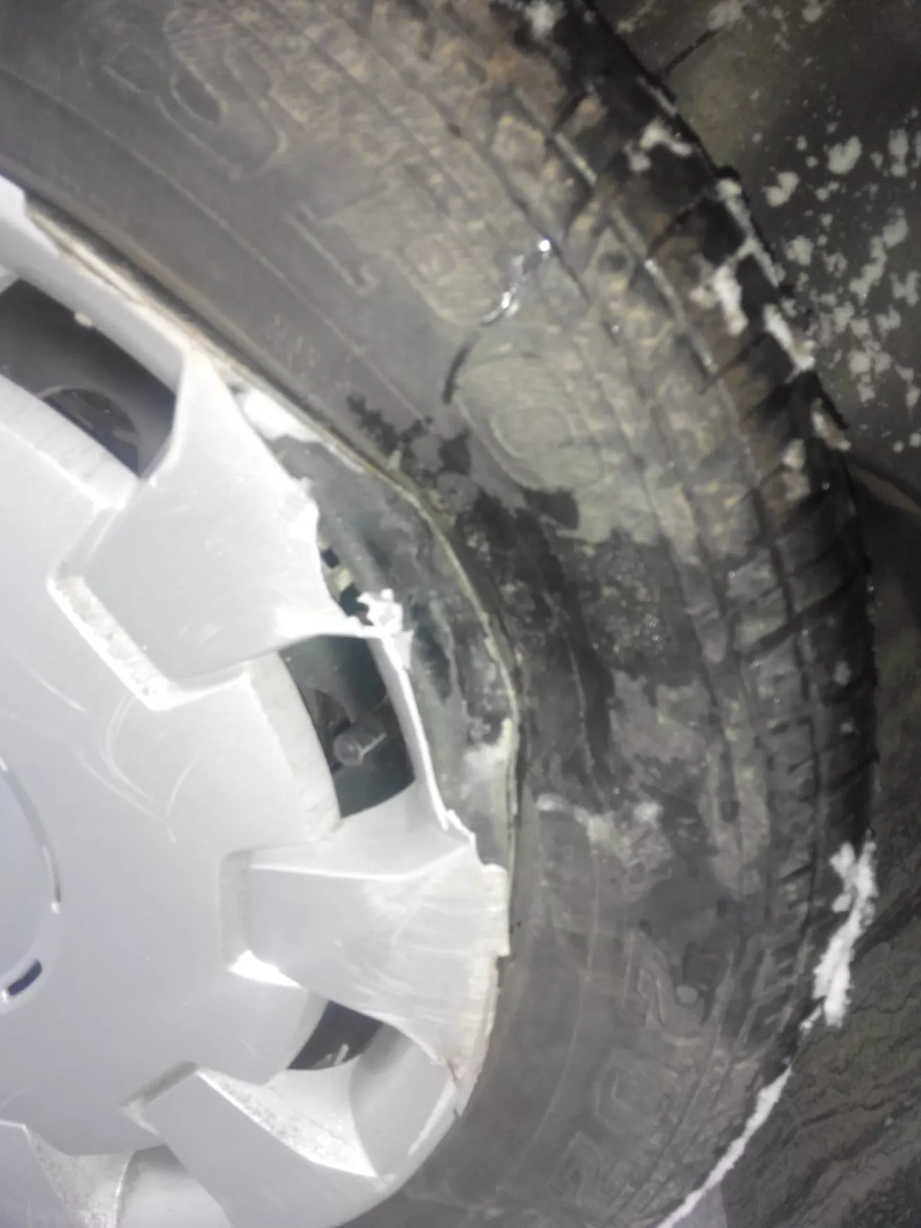 Выпал снежок, приспичело мне выгулять своего железного коня и тут такое неприятное происшествие при повороте налево меня начало нести(((и тут удар правым задним колесом об бардюр, я думал уже всё прийдеться ставить запаску при -5С°. Когда вышел с машины и посмотрел на последствия, был немного ошарашен так как думал что выкатать диск уже не реально. Но решил поехать на шиномонтаж ну малоли и не пожалел, когда приехал парень шиномонтажник был в а**е и задал мне один вопрос "как ты не розбулся вообще?" вообщем катал он его минут 35-40(выкатал вообще идеально огромное ему спасибо) да и взял с меня всего 50грн(тоже был приятно удивлён) но колпаку пришёл пиз**ц короче нужно теперь искать где-то