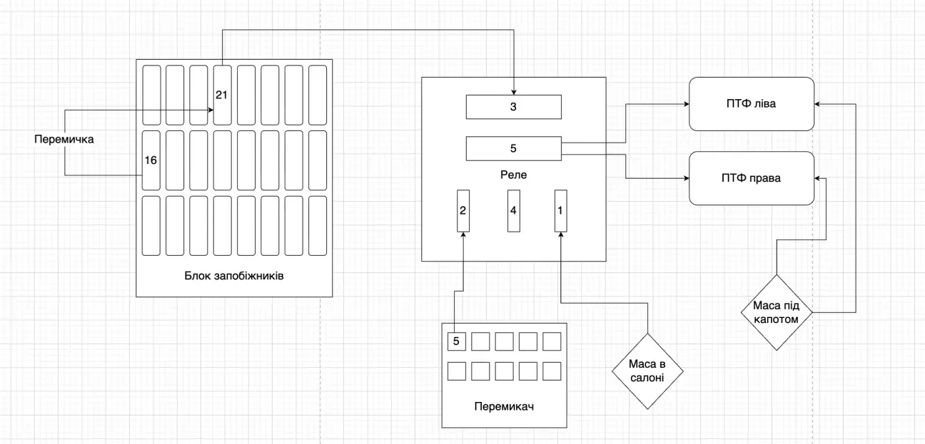 Якщо немає змоги перепаяти блок як описано в попередньому пості, то ПТФ можна під'єднати і через реле. Не буду в цьому пості дублювати номери ПТФ, перемикача, та іншого, а саме загострю увагу на схемі підключення.