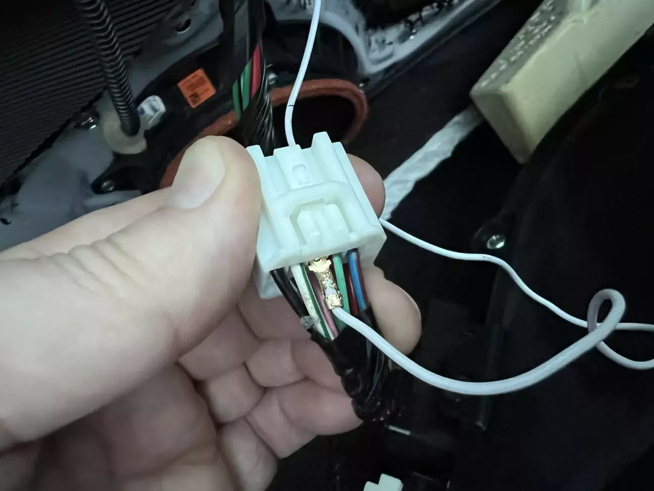Дополню. Тянул белий провод к фишке соседней (блок стеклоподьемников) постояний плюс при АСС, есть как в левой двери так и в правой. Взял клемку обжал и всунул в фишку , изоленточка в помошь, не стал врезатся и паяться, Так как думаю покатаюсь так, посже может переподключю с протяжкой провода для+ при габаритах, пишут что нету в правой двери. Времени в обрез на улице дубняк, оставил так.