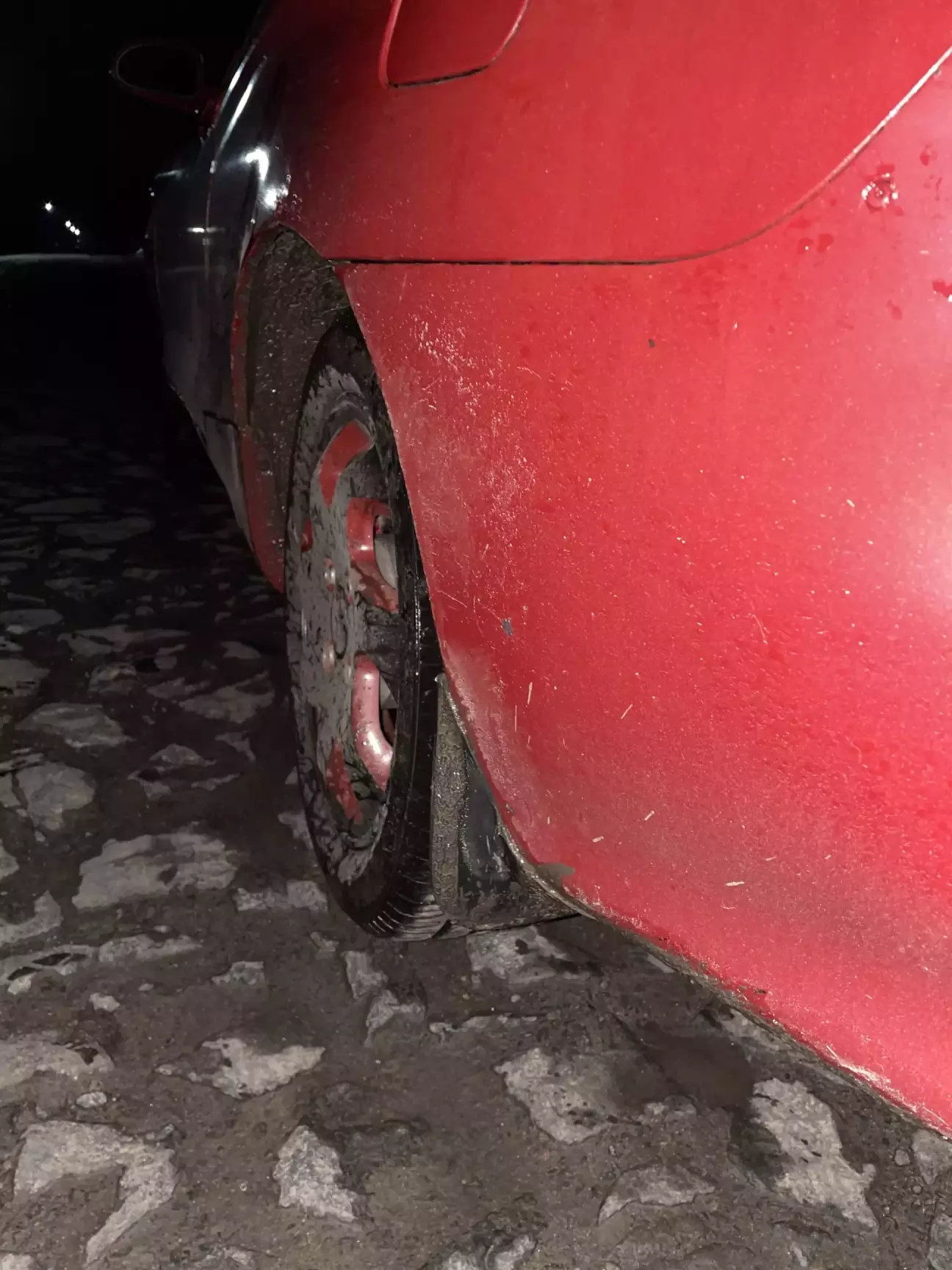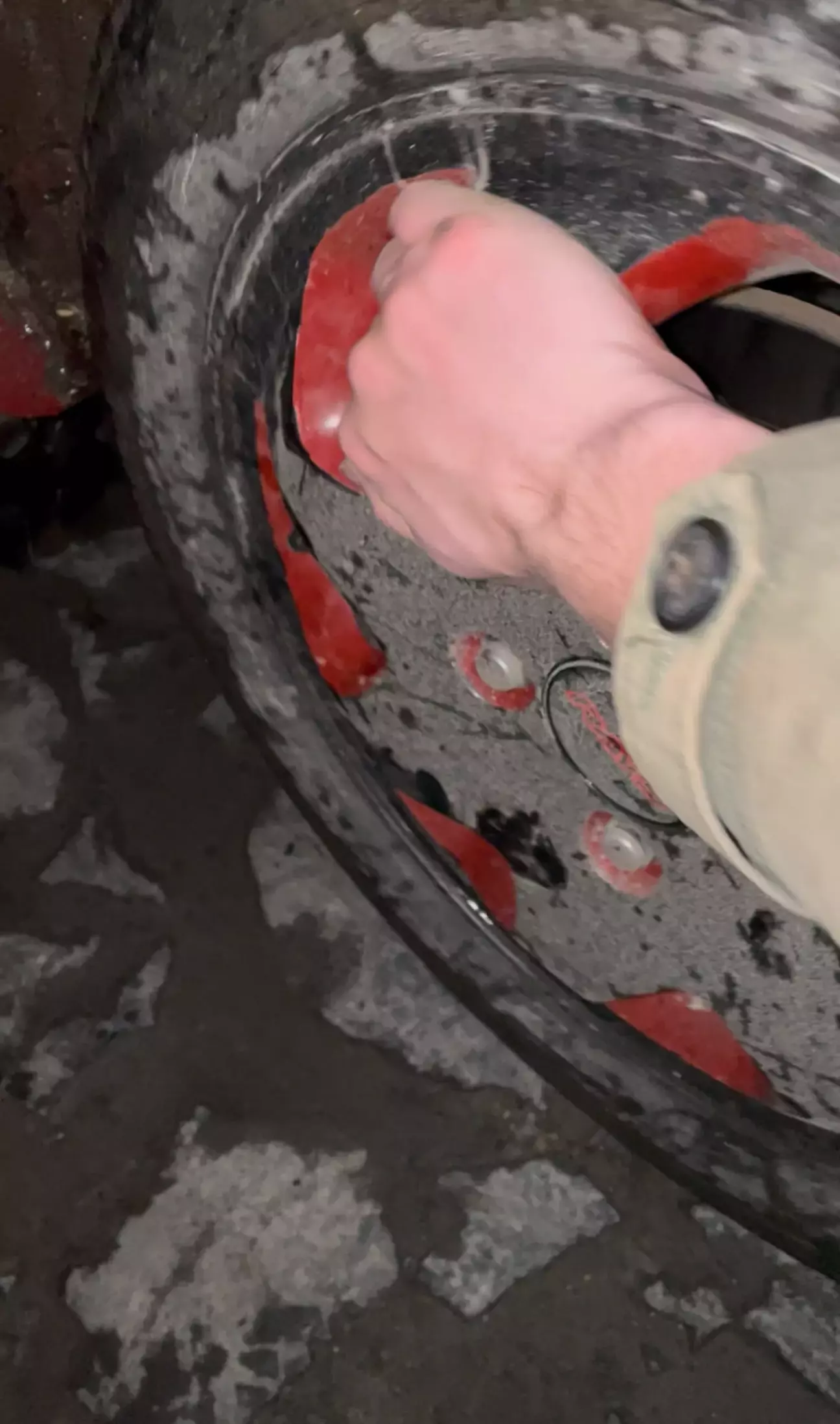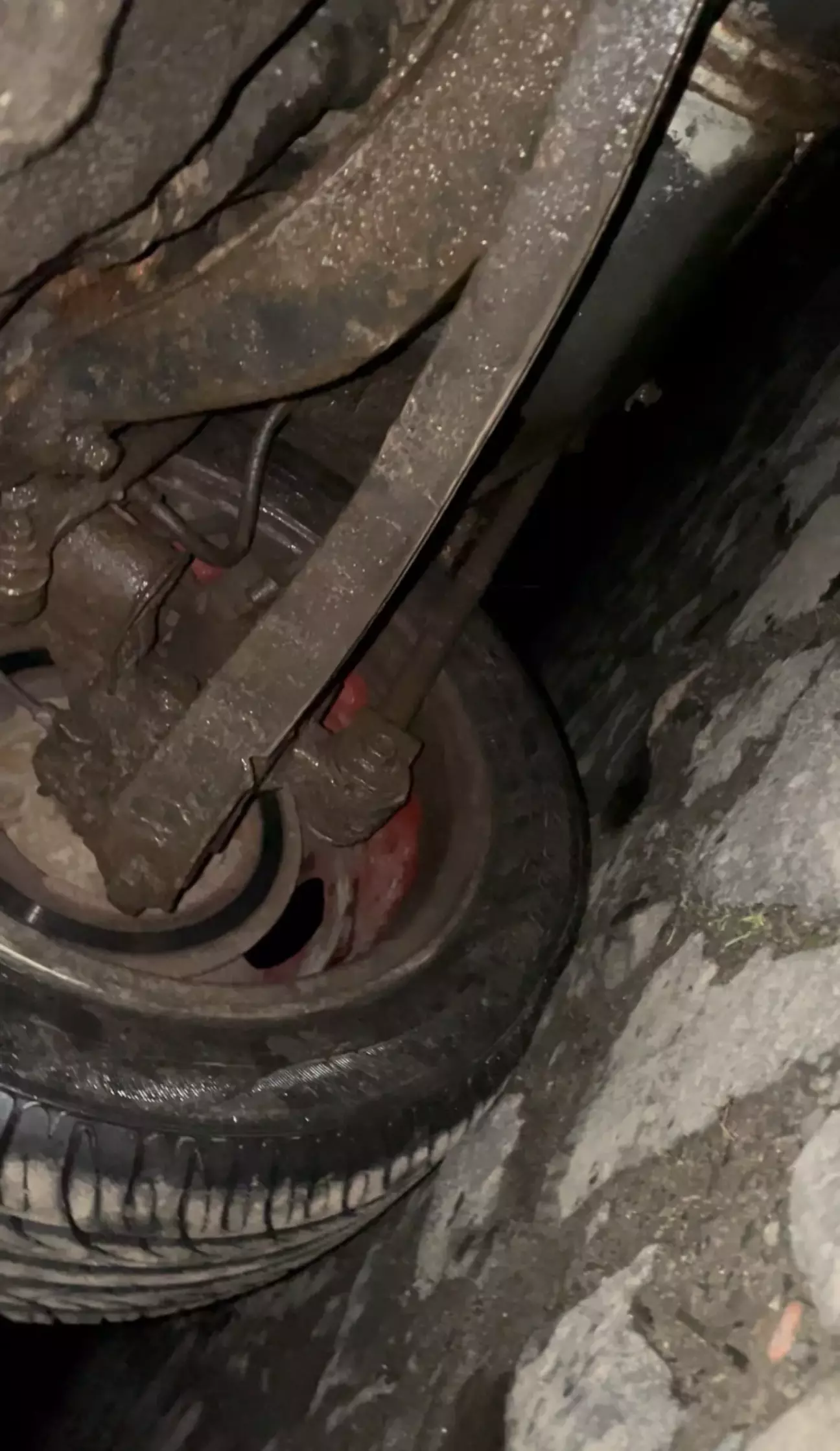 Заряджаю трішки телефон, починаю світити ліхтариком і бачу що колесо ніби під кутом стоїть.