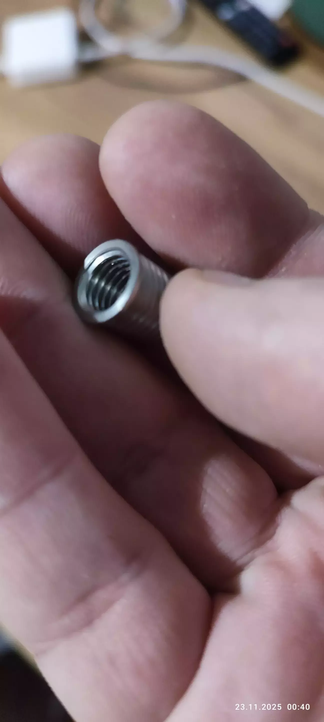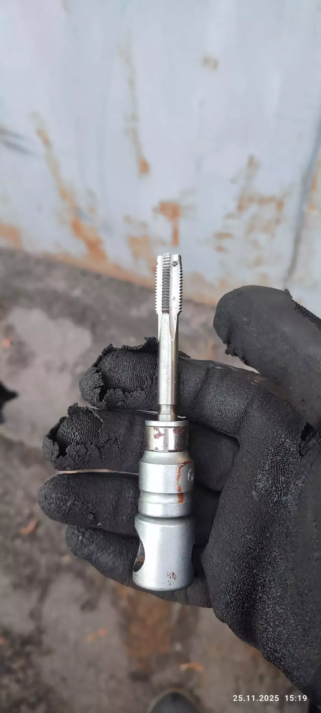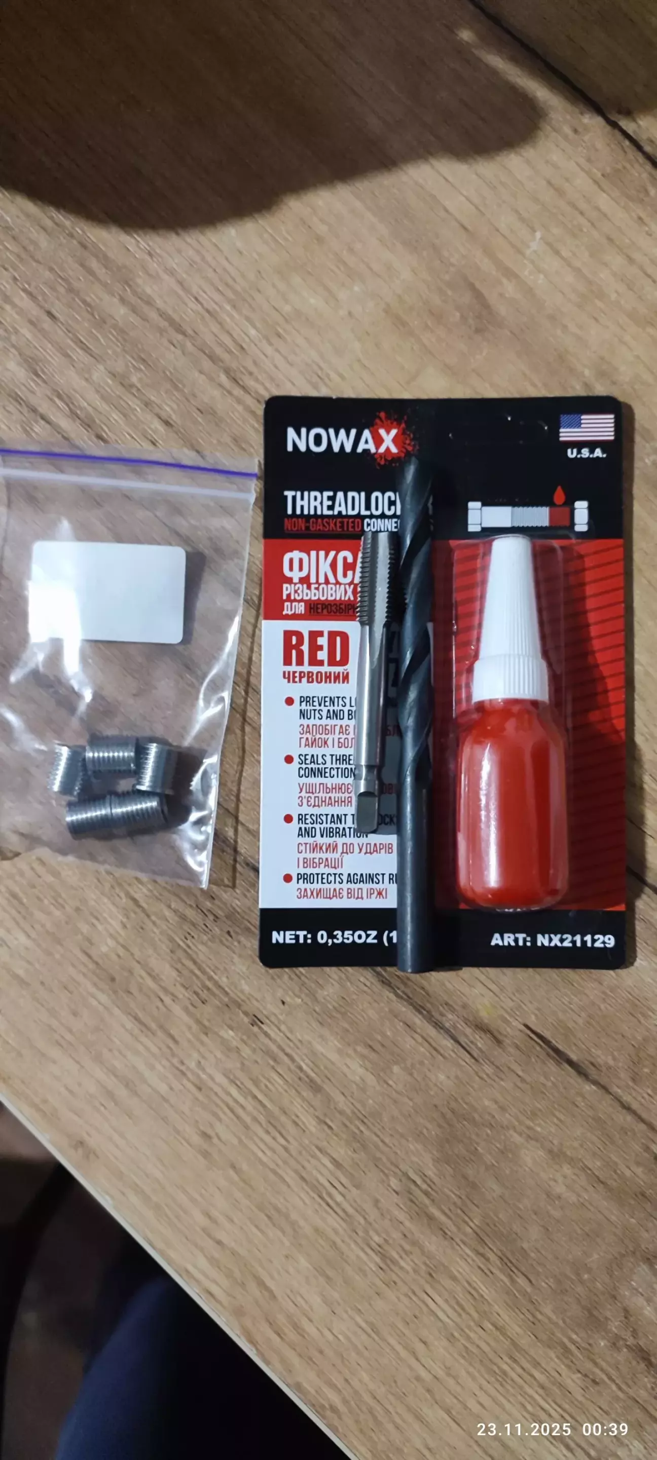 Ждав я замовлення (бо все це було перед вихідними) аж до вівторка; як все забрав, поїхав на гараж. По відновленню яка процедура - треба розсверлити стару дюрку та вкрутити різьбову вставку, яка кріпиться на червоний фіксатор різьби. Ну я так і зробив) але не очікував, що метал кулака буде так легко свердлитися, реально зайняло це 1 хв. Основний нюанс - що засверлитися треба рівно, після чого я взяв мітчик з комплекту та нарізав різьбу, попередньо мокнувши мітчик в відпрацьовану оливу, після чого промив нову різьбу та мітчик ведешкою та знову пройшовся ним, щоб зробити чистовий різ. Далі, ще раз промив все і дочекавшись, поки все висохне, поставив вставку на фіксатор та зачекав 15 хв, для установки використав стару направляйку.