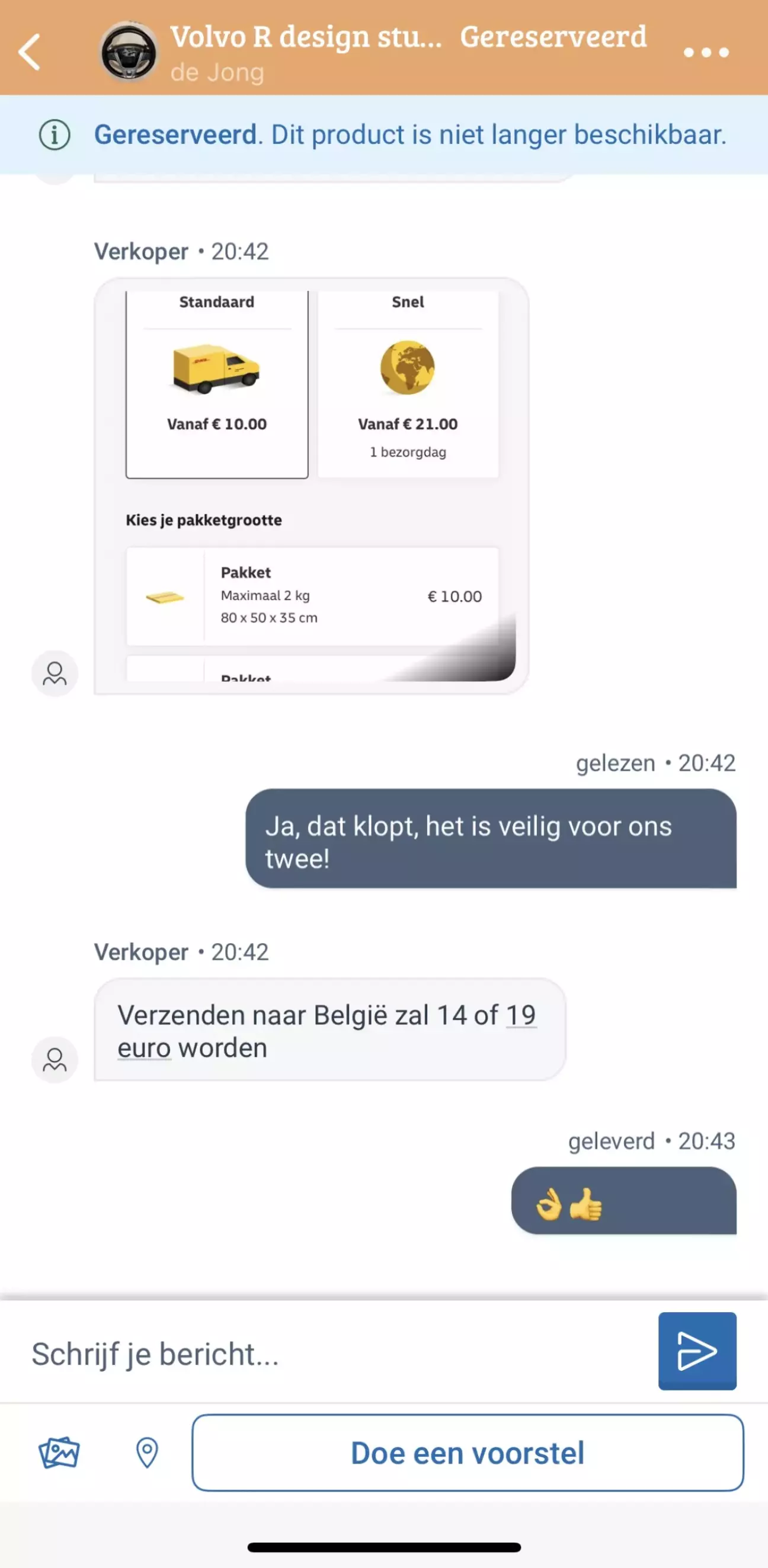 Бінго, процес пішов. Його реквізити, моя оплата включно з доставкою +19€, моя поточна адреса проживання. Угоду завершено, кермо в додатку вже без ціни, натомість напис «Зарезервовано» 👌