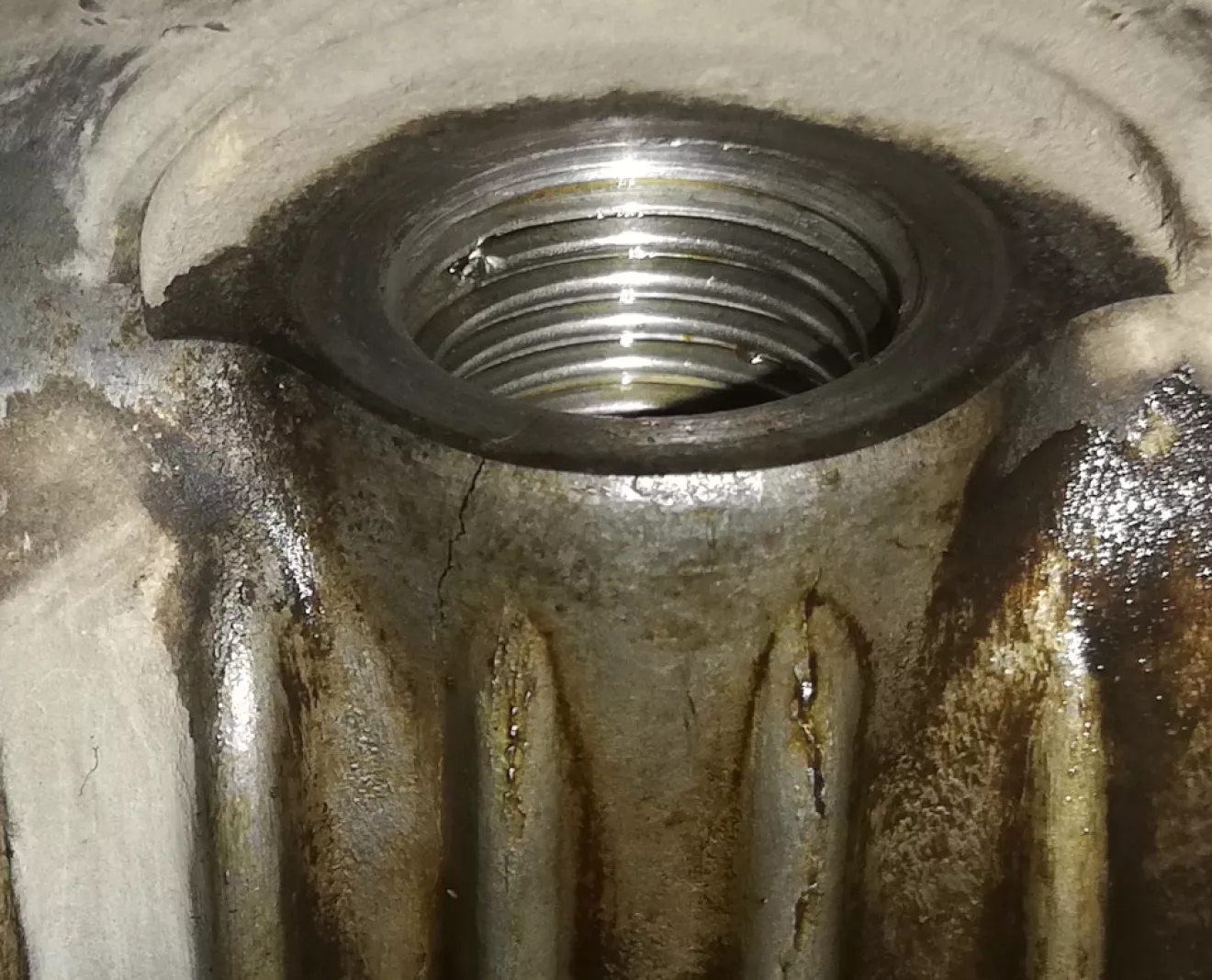 Якось одного дня, заздалегідь записавшись на ТО, приїжджаю — усе йде за стандартною процедурою. Стою біля авто й спостерігаю за майстром. Масло злив — усе ок. Закрутив пробку з заміною мідної шайби, як і належить, але… Бачу, стоїть і дивиться він на пробку, витирає пальцем, знову дивиться, знову витирає. Тут у мене вже закрадаються сумніви. Підходжу ближче — і все стає зрозуміло: перетягнув до тріщини(((.