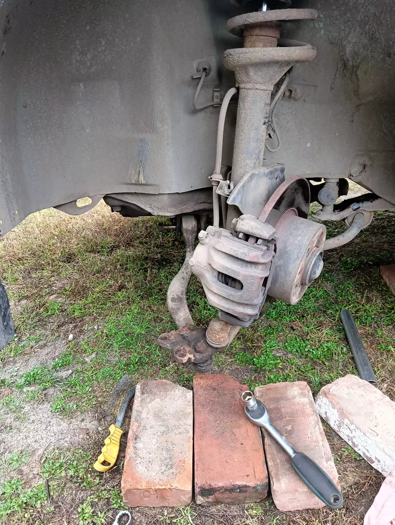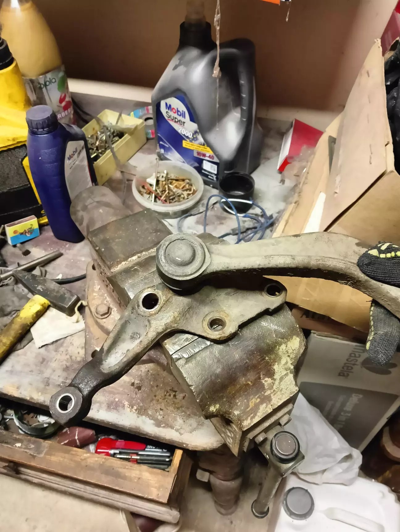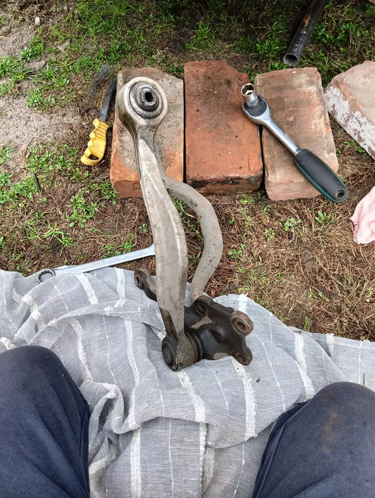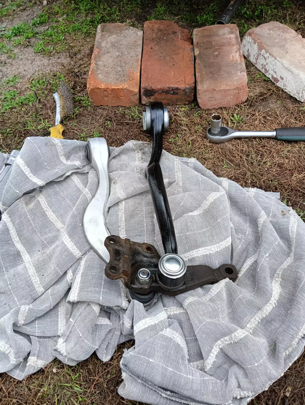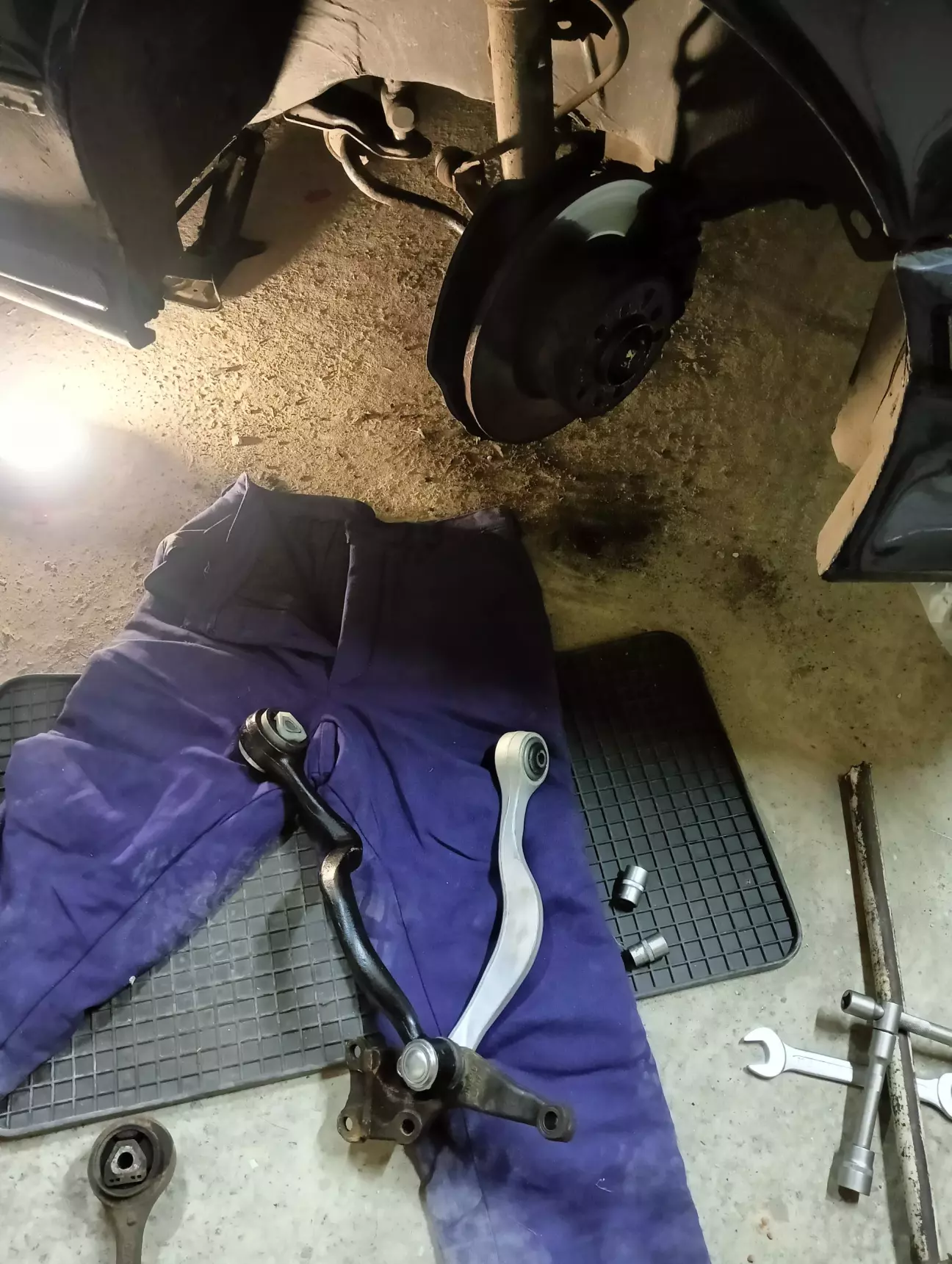 Дуже мало вільного часу, я б сказав що його майже немає, машина їздить кожен день, коли 10-20 км за день коли 100+. Що маємо зараз, патрубок не замінив, хоча лежить новий і чекає заміни, їжджу в бережному режимі, по трасі не більше 90, по місту на 2-3к обертів і слідкую за рівнем і температурою ОР. Замінив комплект передніх ричагів і ліву стійку стабілізатора, було два кривих стальних оригінальних ричаги з перепресованими сайлентблоками з яких один мав зношений шарнір, інші два ричаги ще могли б поїздити, але вже вирішив замінити комплектом. Але машину тягає зі сторони в сторону по передку як і до цього, при цьому немає якоїсь закономірності. Заїхав на яму до знайомого, швидко знайшли причину, розбита втулка маятника. Ще є теча масла, трохи з-під клапанки та ще більше з-під датчика фаз який я замінив і поставив тоненьке гумове кільце, моя помилка в тому що я не наніс герметик, аж соромно за дитячу помилку. Фуууух, на цьому наче все, не дивлячись на недоліки, старий німець вивозить все це кожен день, сподіваюсь що найближчим часом буде хоча би один вихідний за який все це я зроблю.
