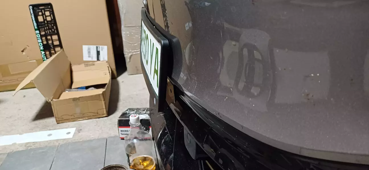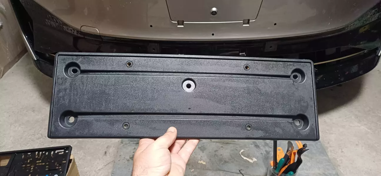 Я закріпив оригінальну VAG-рамку на верхні отвори. Проте вид псувало те, що під рамкою навіть здалека було видно нижні кріпильші отвори (металеві клепальні гайки / різьбові заклепки)😞