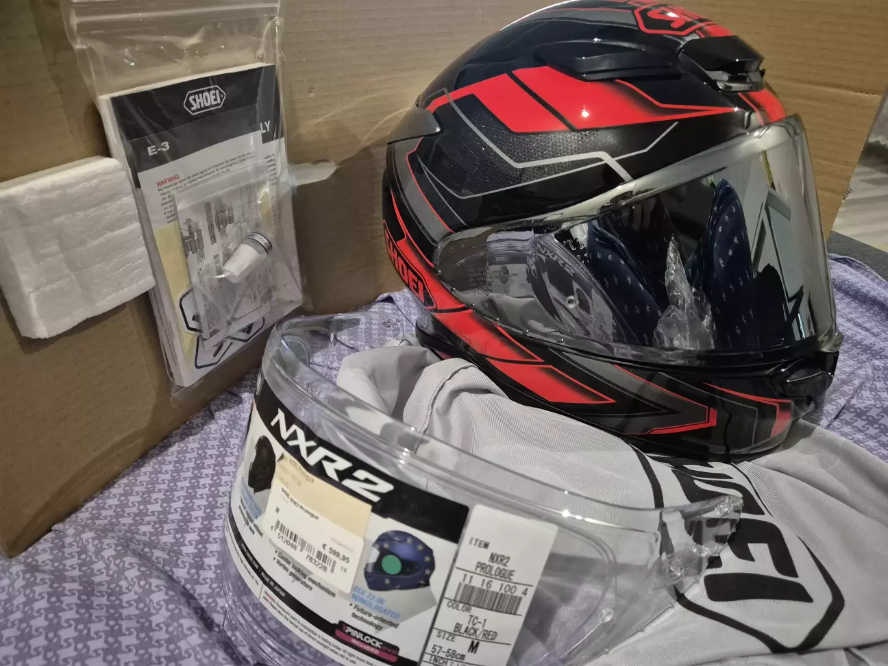 У комплекті 2 візори з пінлоками що не дає запотівати склу, коробка чохол та інструкція, стан як нового ) купував я його у motoekipdnipro. Вибирав звісно щоб колір співпадав з кольором мого ducati. Як на мене це один з найгарніших шоломів у цього виробника, і доречі мій перший шолом також shoei.