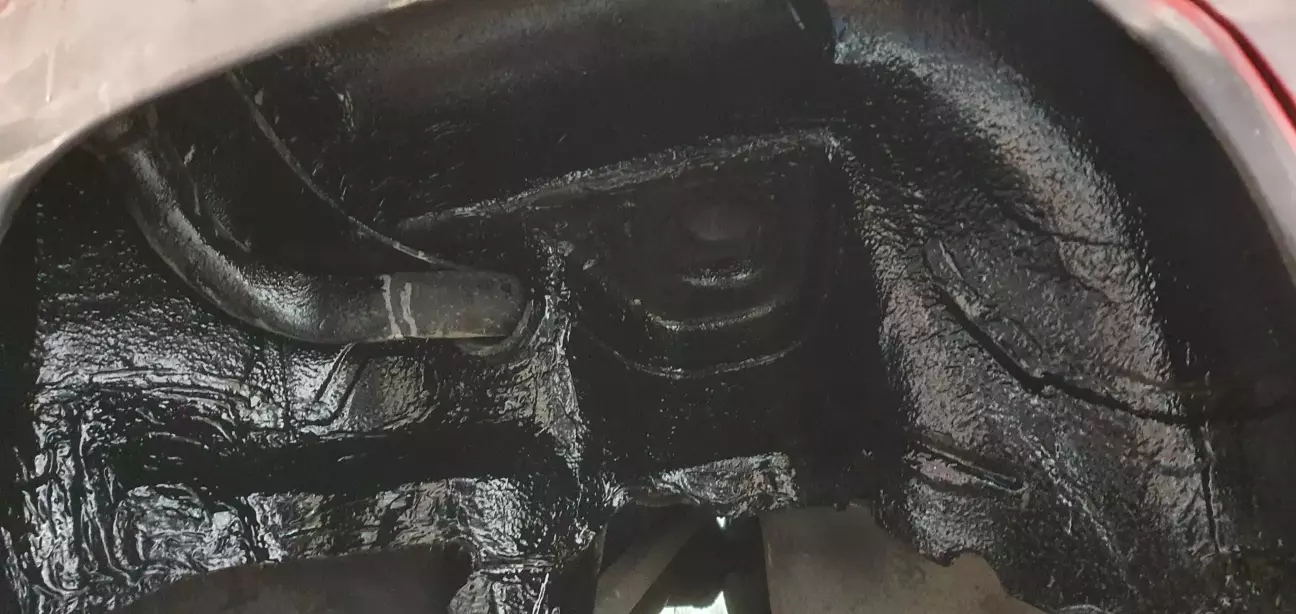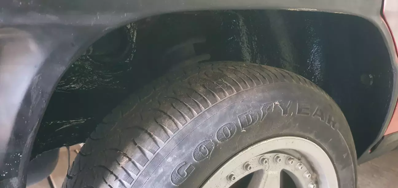 Далі зняв задній правий амортизатор, зачистив від іржі, зняв гумові заглушки, залив усередину арки мовиль, обробив арку захисним покриттям і поставив назад на колесо.