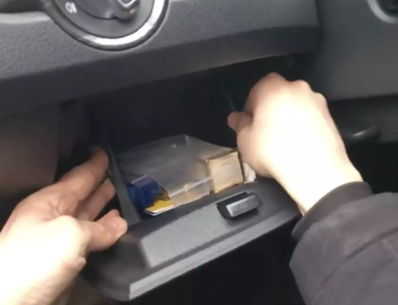 І знімаємо маленький бардачок за яким знаходиться блок запобіжників, для цього відкриваємо його і стискаємо