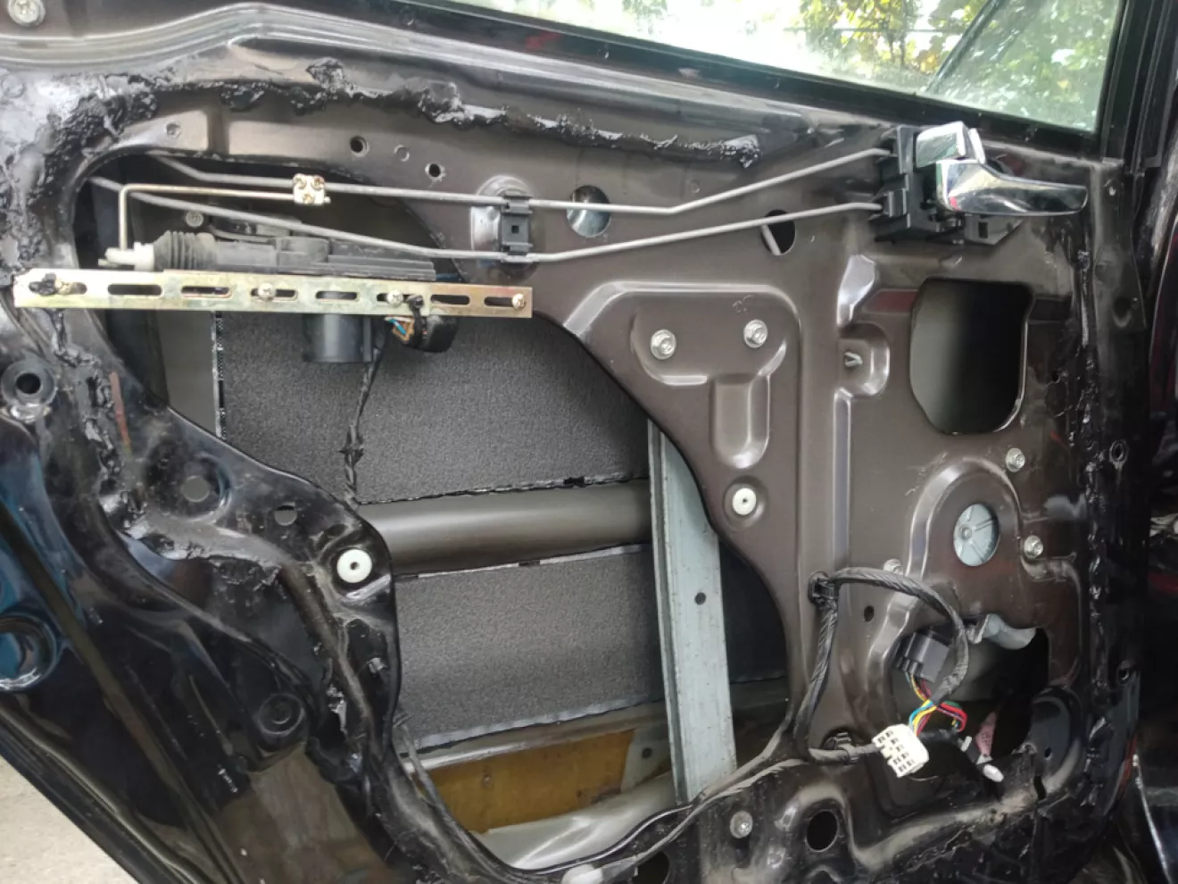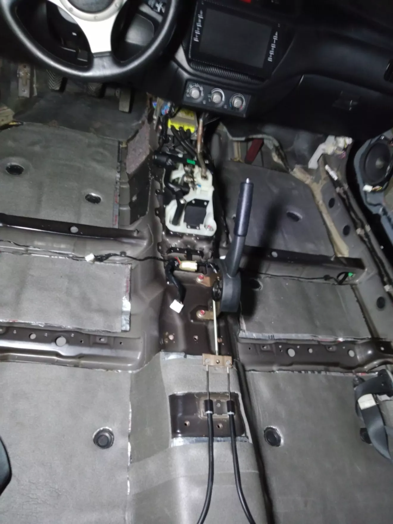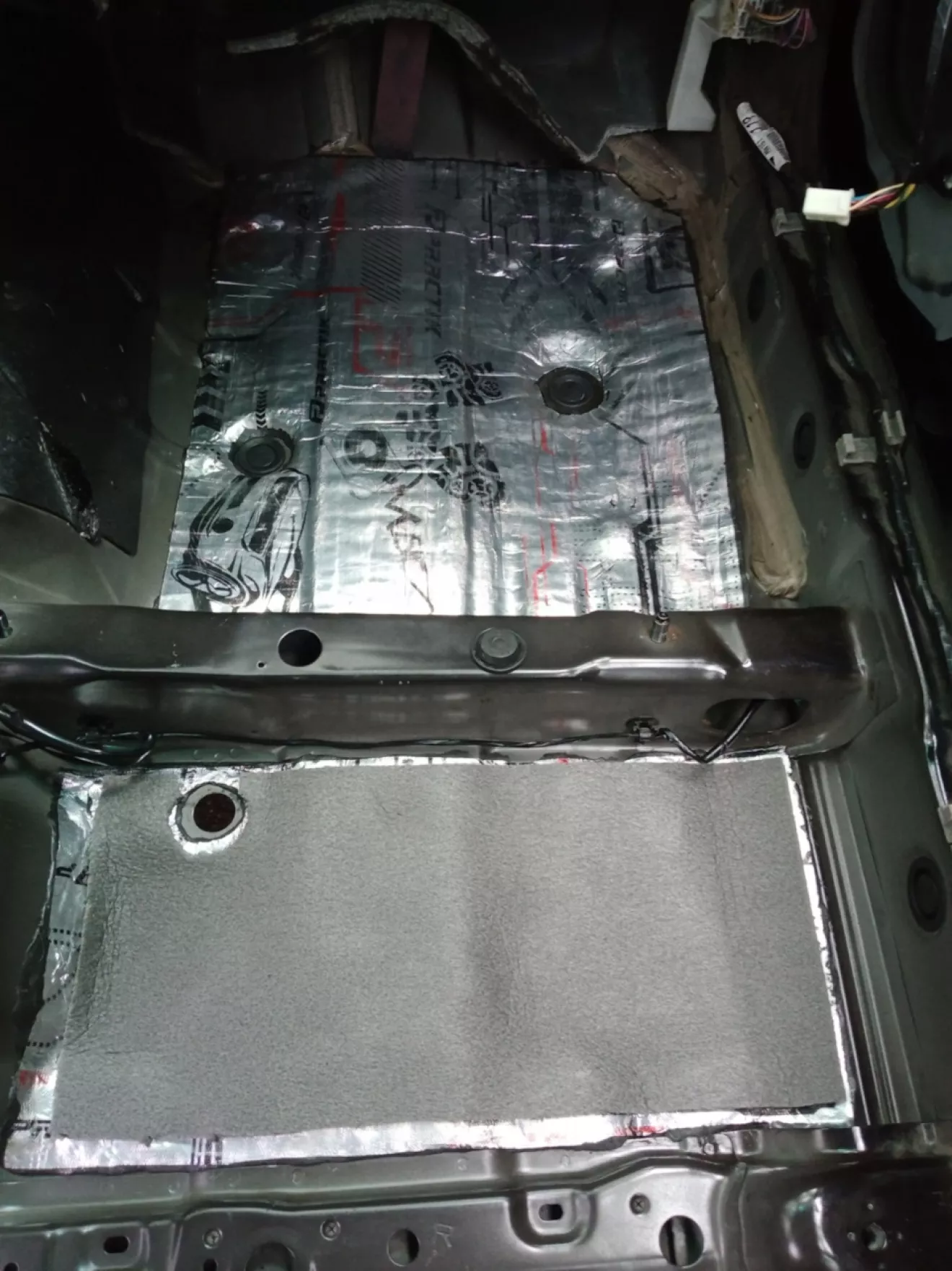 Далее избавился от старой виброизоляции, так как местами была потрескана, местами пересохла. Тщательно вымыл все днище, обезжирил, начал укладывать виброизоляцию, хорошо прикатал, сверху наклеил шумку и так же хорошо прикатал.