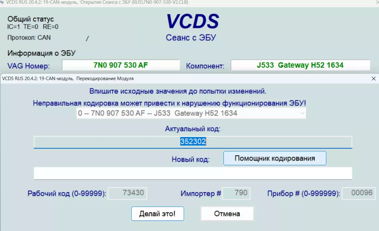 11. Включаю запалення, підключаю VCDS та кодую 👨💻 в новий гейт код та список обладнання зі старого:
