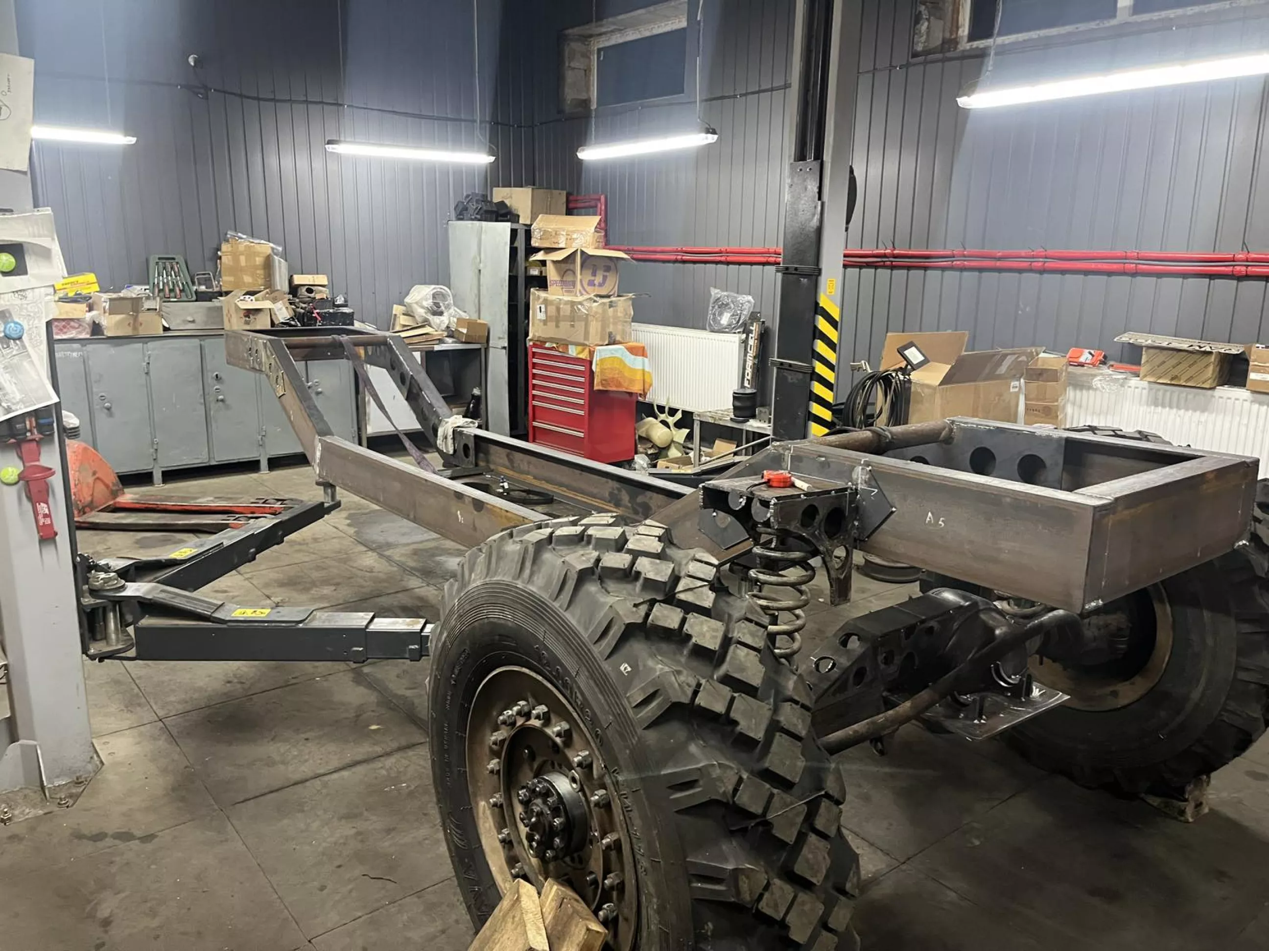 переделывается. Впереди тормозная система и рулевое управление на основе насос дозатора, хочется иметь обе поворотные оси. Да и эту конструкцию надо как то останавливать!