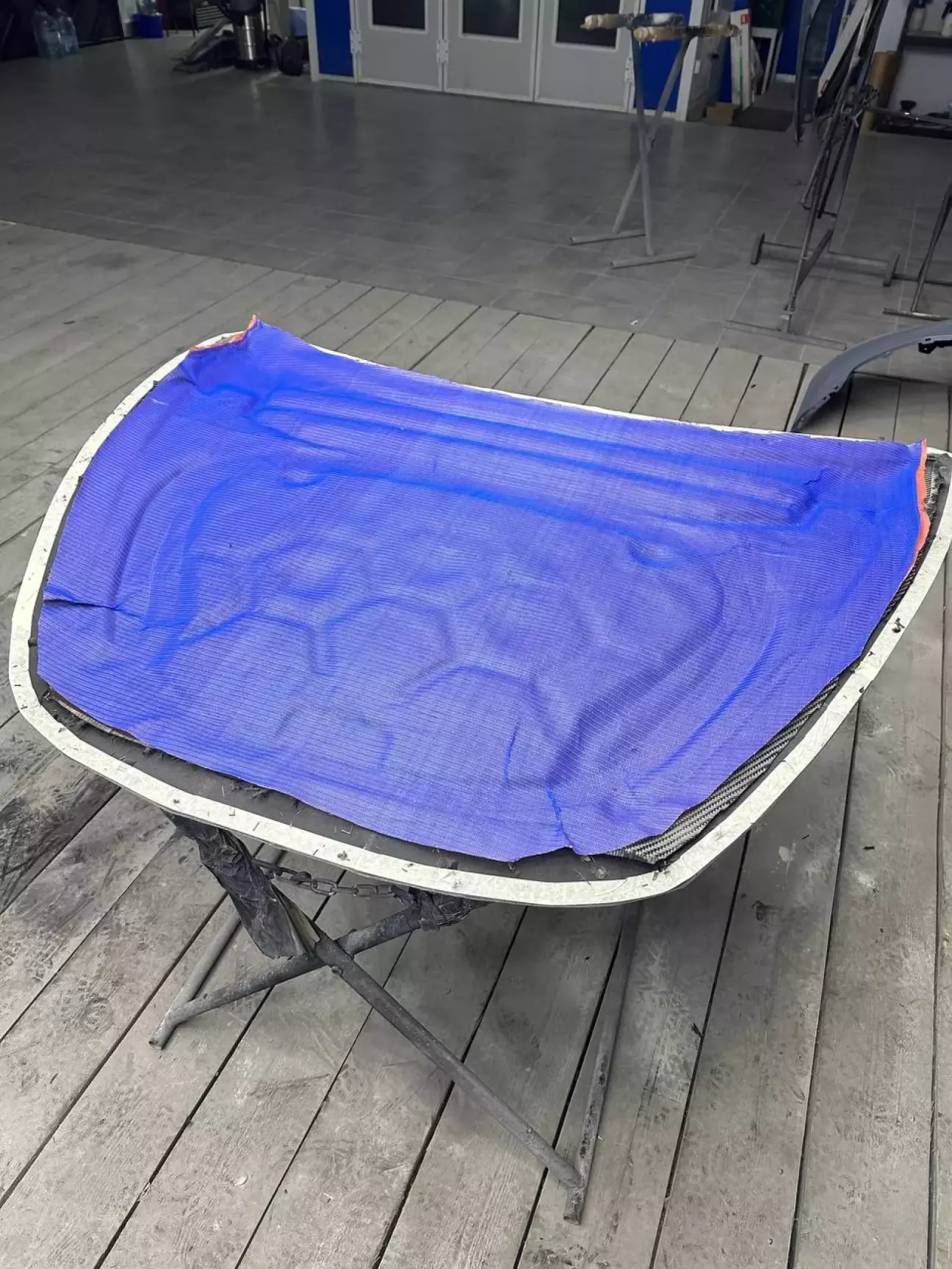 Після того як визволили карбонові елементи, я зі старого, помʼятого капоту повирізав закладні для кріплення самого капоту та замка. Брат відрізав все зайве та повирізав отвори для шпильок та кліпсів.