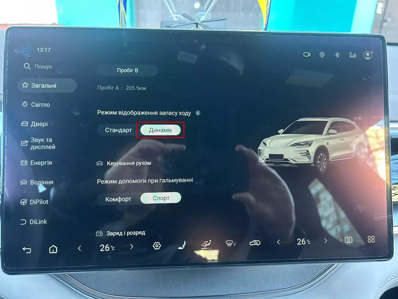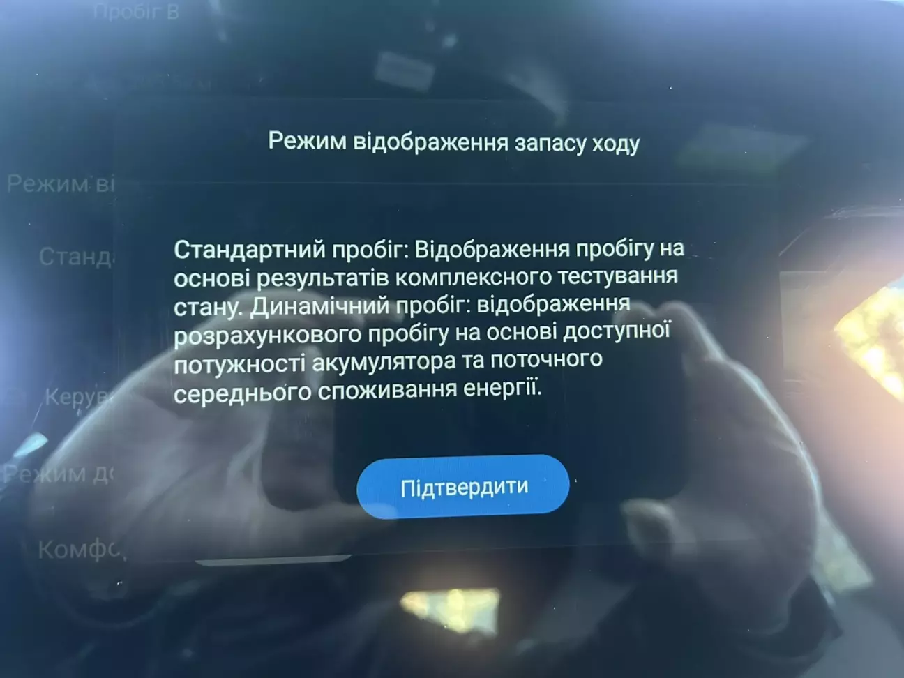 НАЛАШТУВАННЯ – ЗАГАЛЬНІ – РЕЖИМ ВІДОБРАЖЕННЯ ЗАПАСУ ХОДУ і вибрати СТАНДАРТ (при повному заряді батареї буде показник 605 км.) або ДИНАМІК (вираховується із загального середнього показника витрачених кіловат).🚙