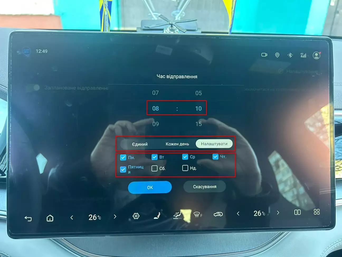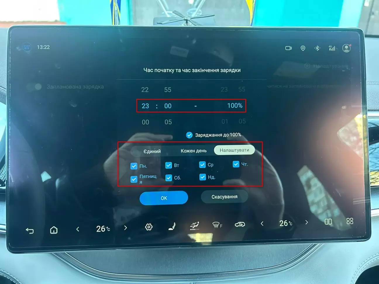 Якщо Ви виставите дні, наприклад з понеділка по п’ятницю, то автомобіль буде прогрівати (охолоджувати) батарею і салон у визначений Вами час тільки у ці дні. Якщо Ви виставите час, наприклад 8.10, то за десять хвилин до цього часу автомобіль почне прогрівати (охолоджувати) батарею і салон та рівно о 8.10 закінчить дану процедуру.