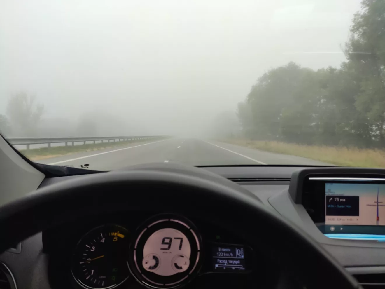 Погода супер, солнышко встаёт настроение у всех радостное и тут спустя км 150 нас встречает туман, да такой что иногда приходилось скидывать скорость до 60км/ч.