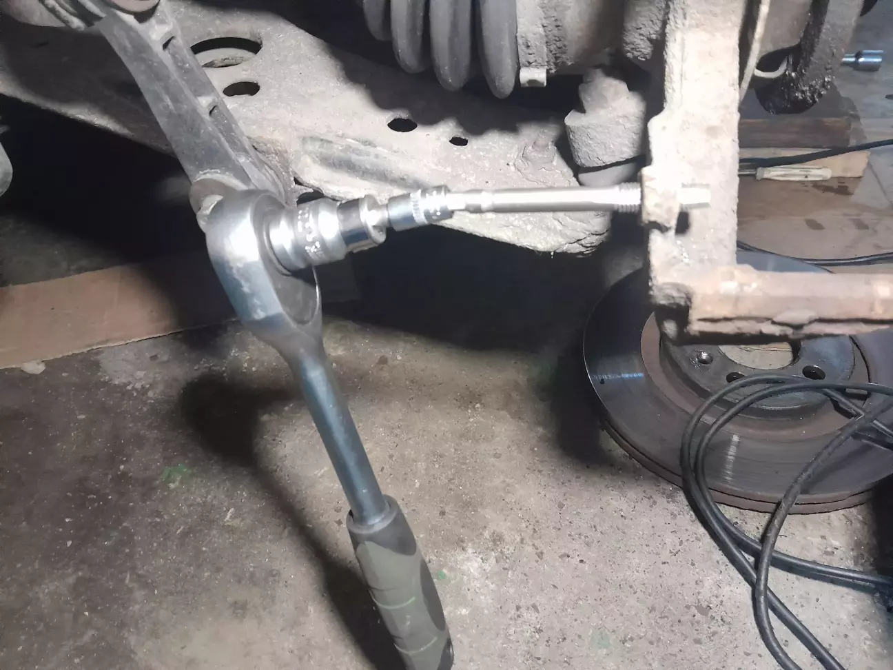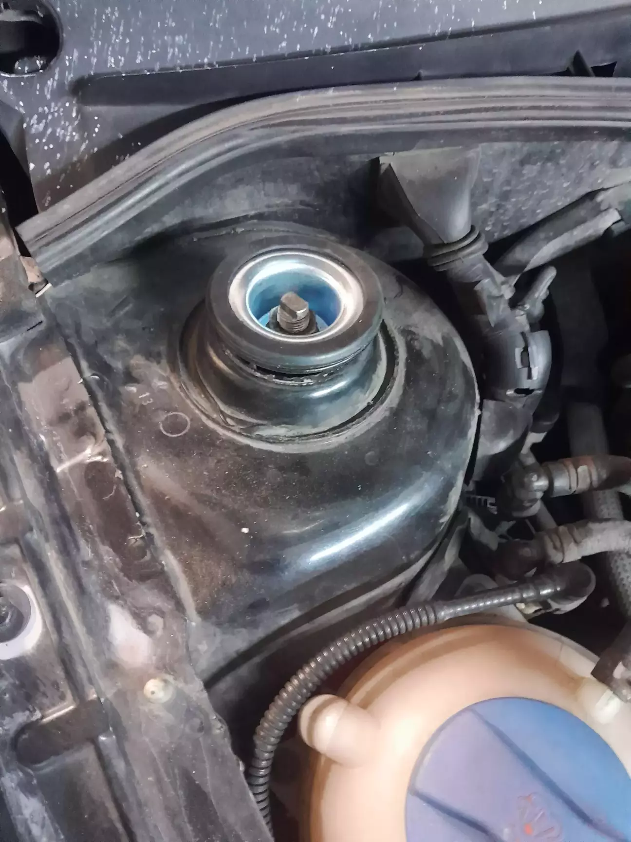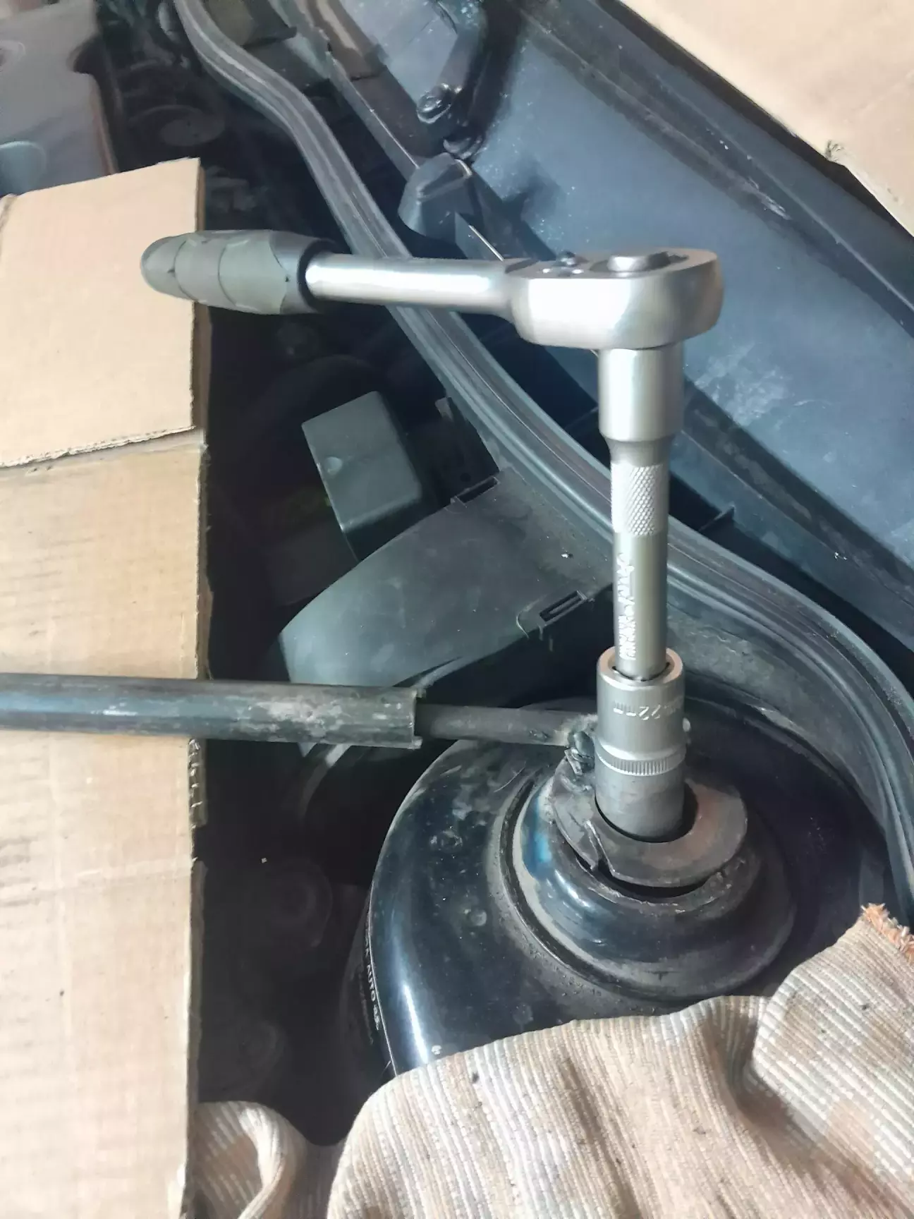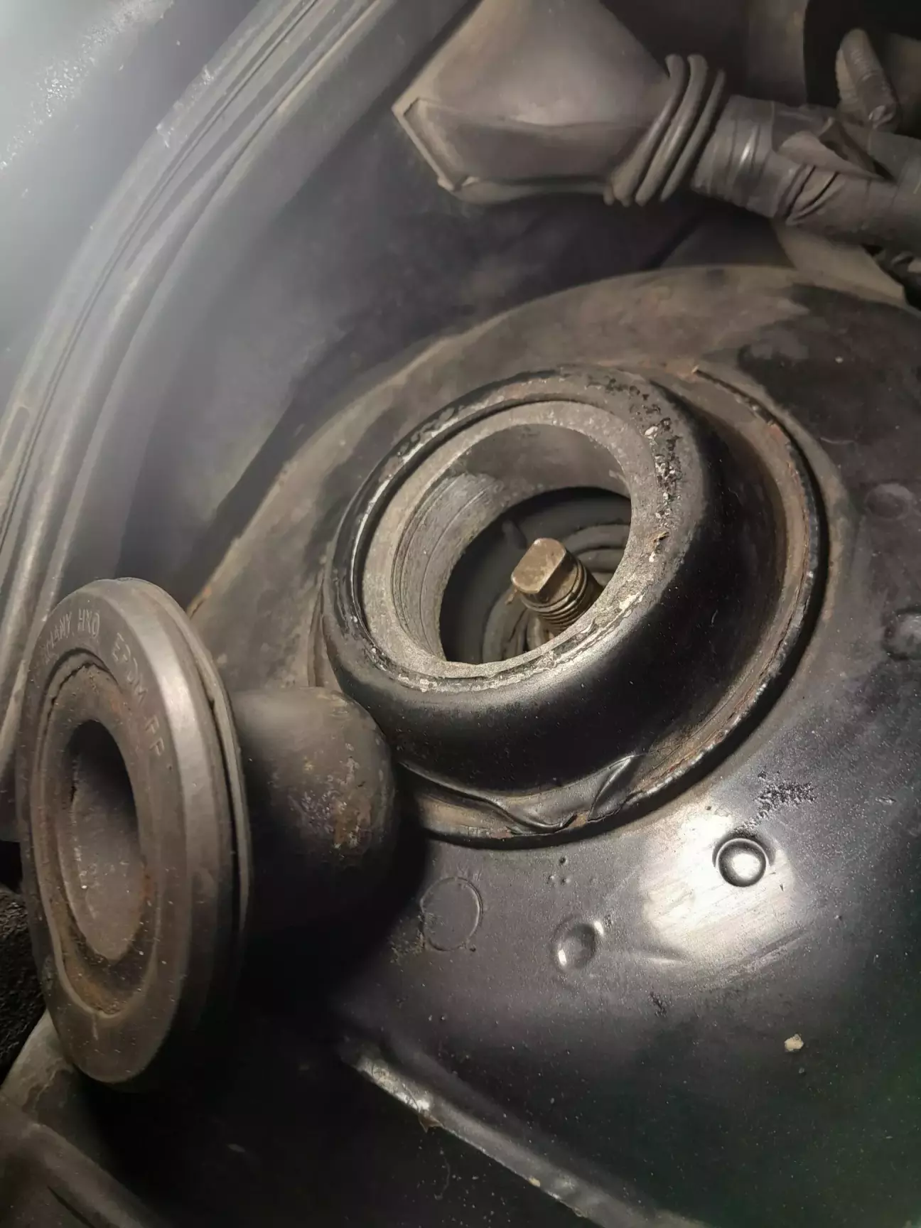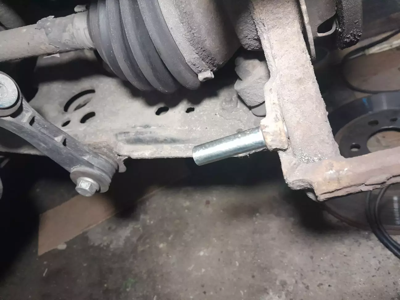 Сайлентблоки на ричагах вивернуло, їм в такому вигляді не довго б залишилось. Якщо в стокі верхня тарілочка відбійника відкручується накидним г-подібним ключем і є можливість за верх притримати шток від провертання, то з проставками ця тарілка глибша і стойку так просто не розібрати. Година нецензурної лексики, роботи болгаркою, сваркою і гайку таки вдалося відкрутити.
