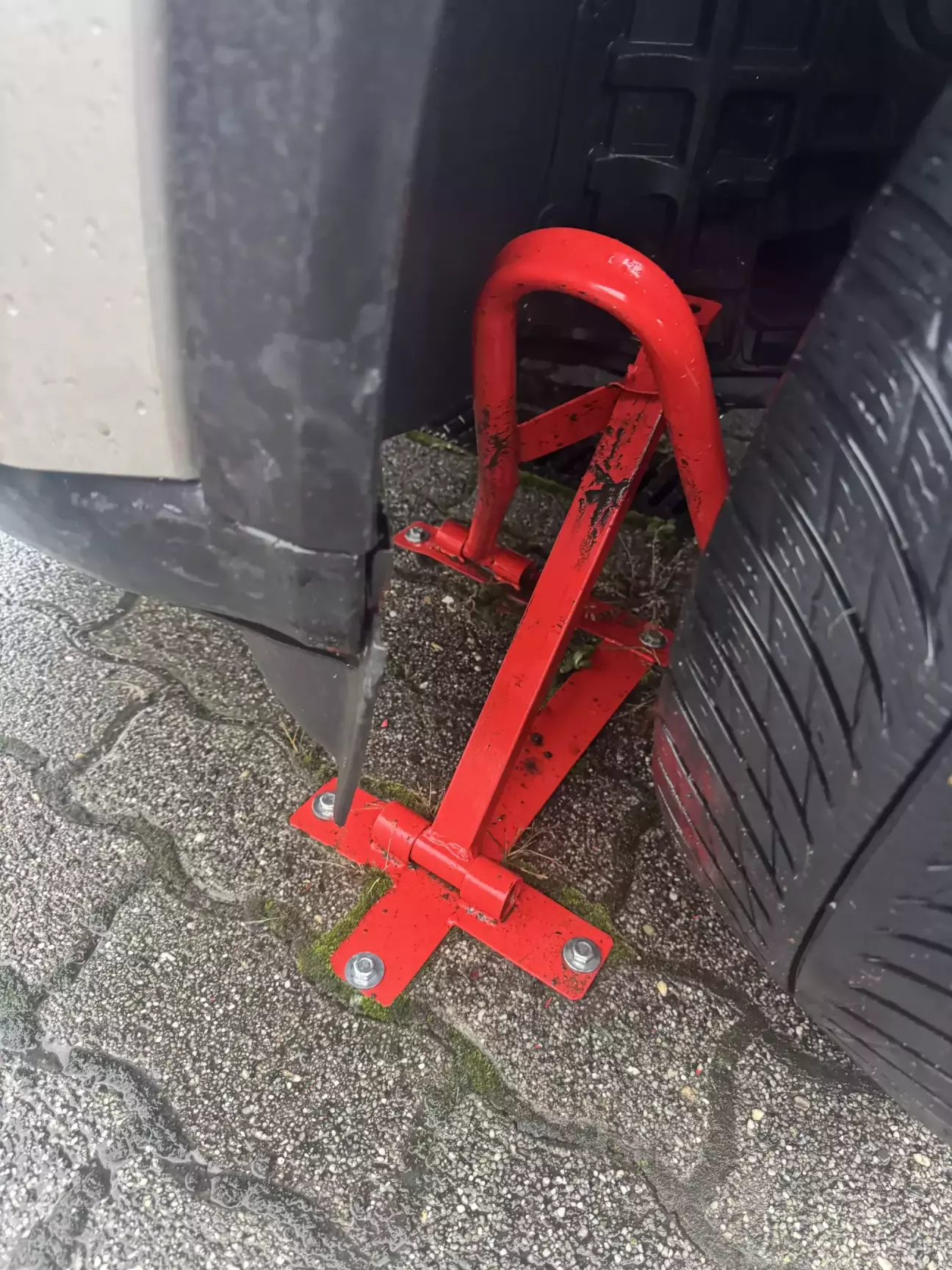 Ця фіговина пройшла вхитру між парктроніками бампером і колесом і автівка зупинилася, коли я натиснув на нього ричагом лівого колеса. Двоміліметровий метал почав ламатися.