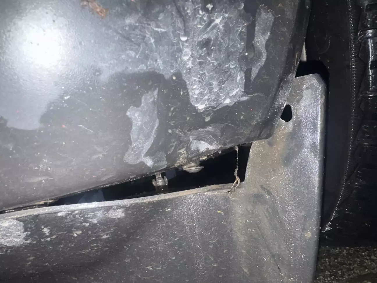 Знизу зірвало один саморіз з переднього бризговичка. Не ймовірно, але факт, саморіз, якщо сильно потягти головкою проходить через бризговика