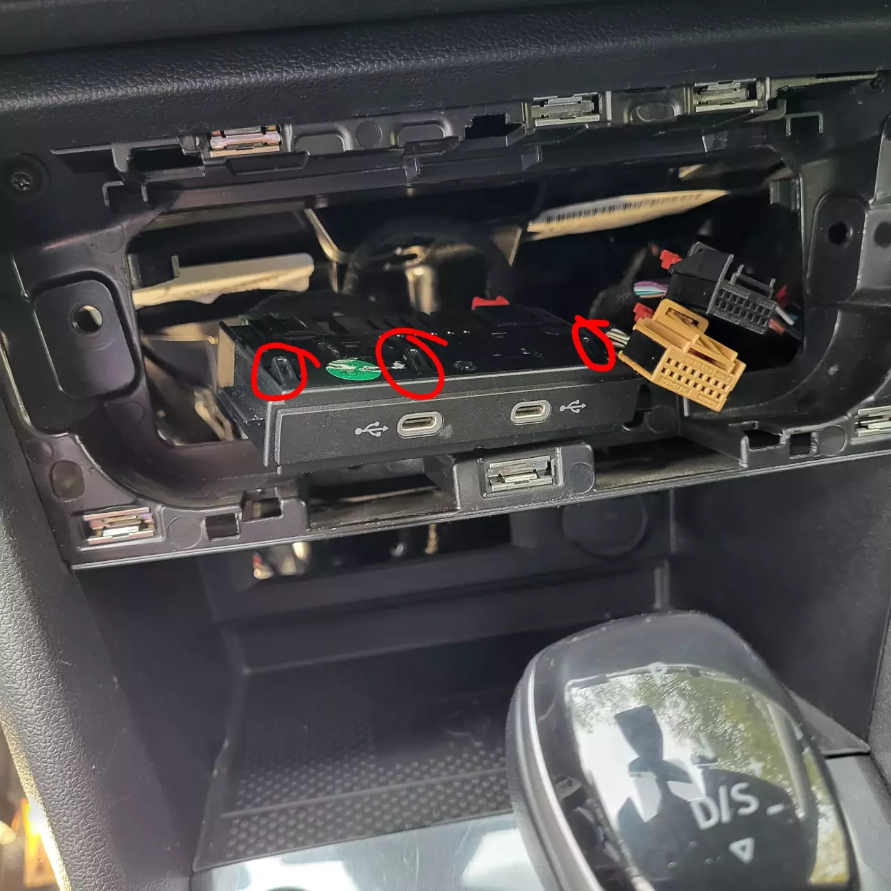 Винімати порт це ще той секс))). Витягнув блок клімата, зняв водійську боковину центрального тонеля. Потім нажимав на вусики та заводив картку пластикову між портом та кронштейном. Цих вусиків три зверху та три знизу.