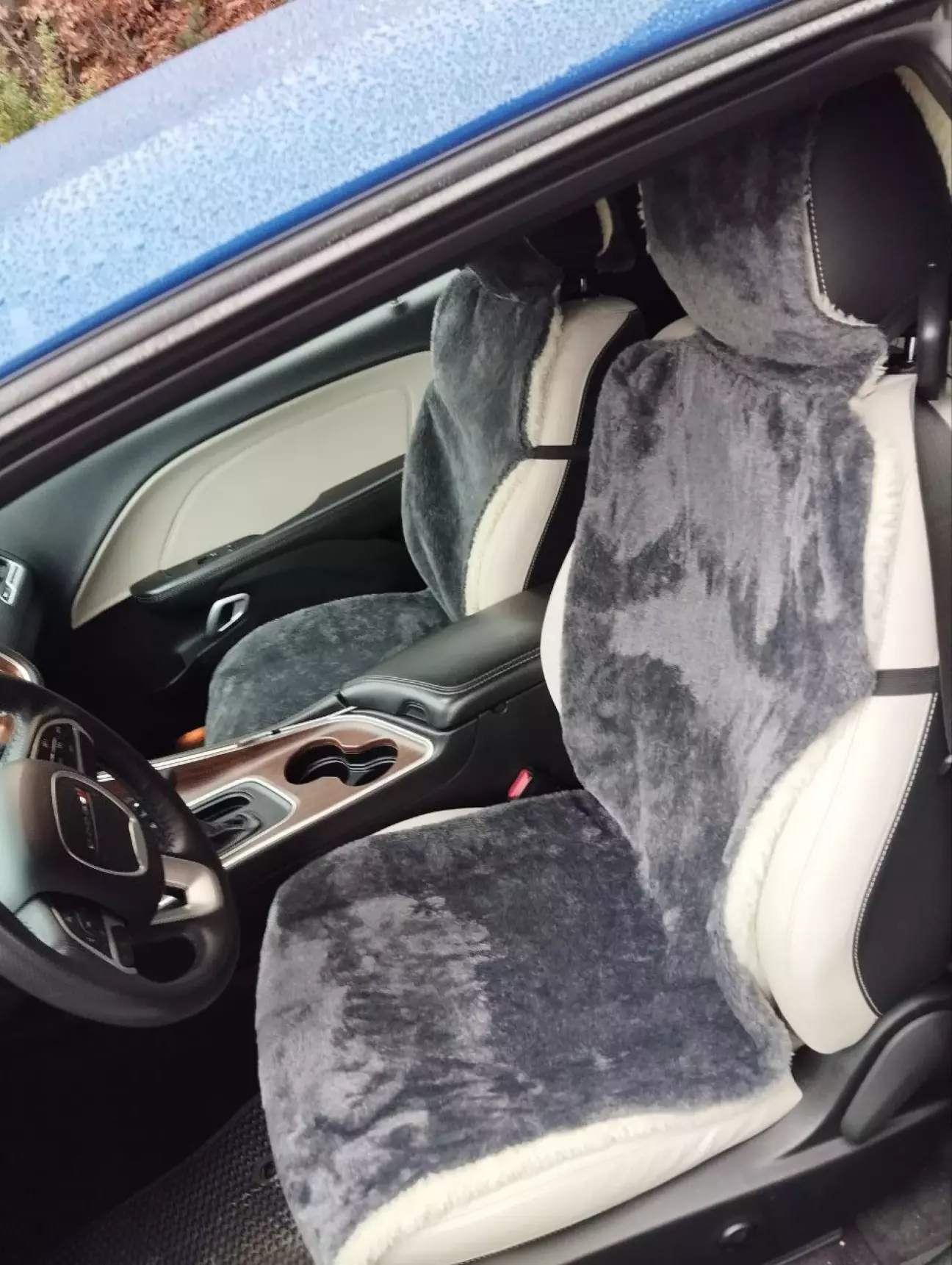 Спочатку хотів придбати дві шкури з вівці. Але ціна якось не збуджувала. Тут в того самого продавця на ОЛХ побачив вже готові накидки сидінь. З набівної вовни, не натуральна шкіра, але й ціна була більш ніж адекватна. Вирішив взяти на пробу. Не сподобається - наприкінці сезону викину в смітник. Пара обішлася 1000 грн. На розуміння в Німеччині щось схоже коштує від 70 евро+. Обрав вариант з кріпленям на підголовник, на саме сидіння, да два кріплення для нижньої подушки. У всіх накидок стандартна ширина 50 см. Для Челенджера це замало. Але індивідуальний заказ від 50 одиниць не збуджував. Були різні кольори, але обрав не світлий, а більш практичний. Знизу набивна вівця брудно-білого кольору, зверху сіра миша)))