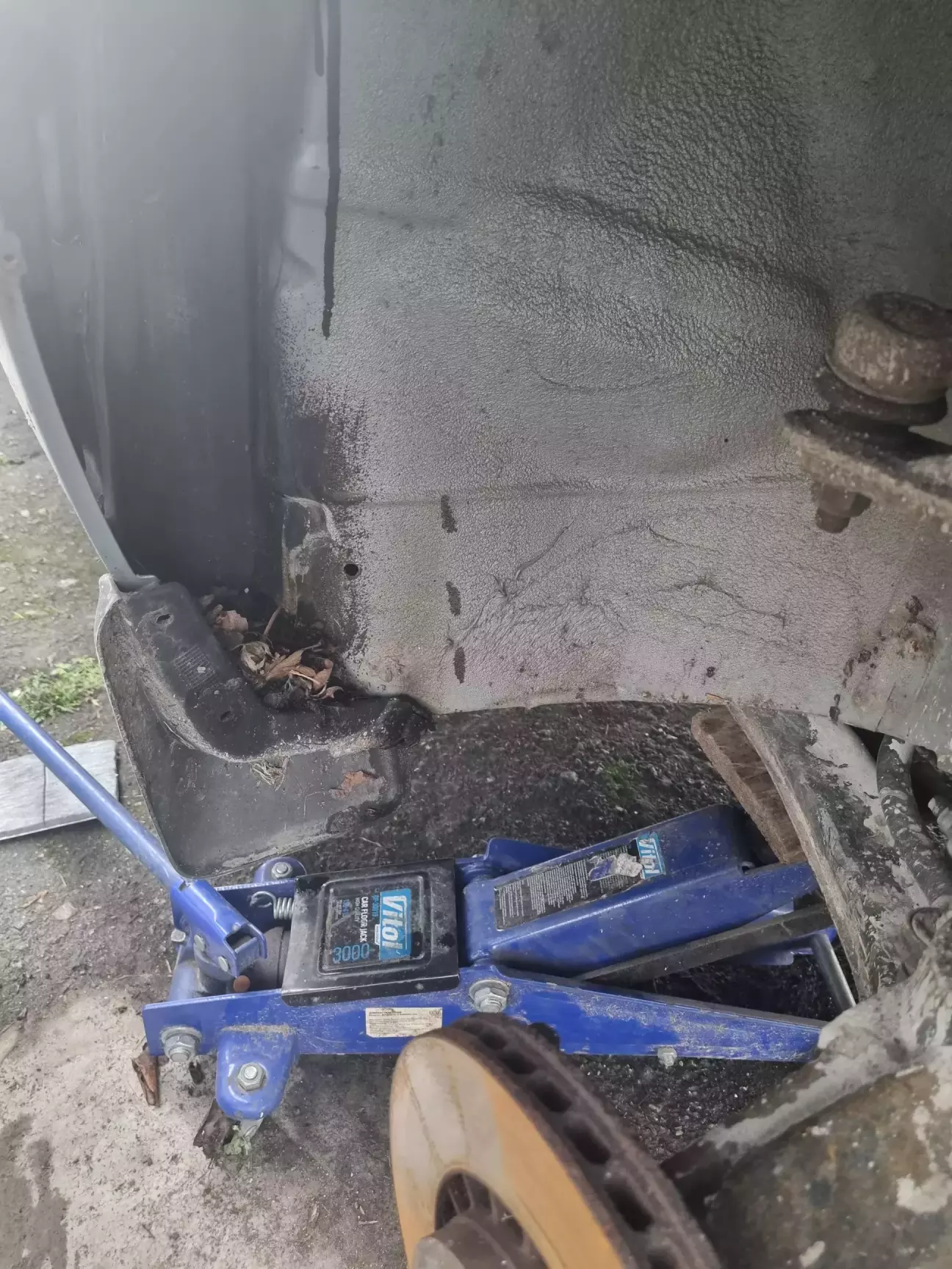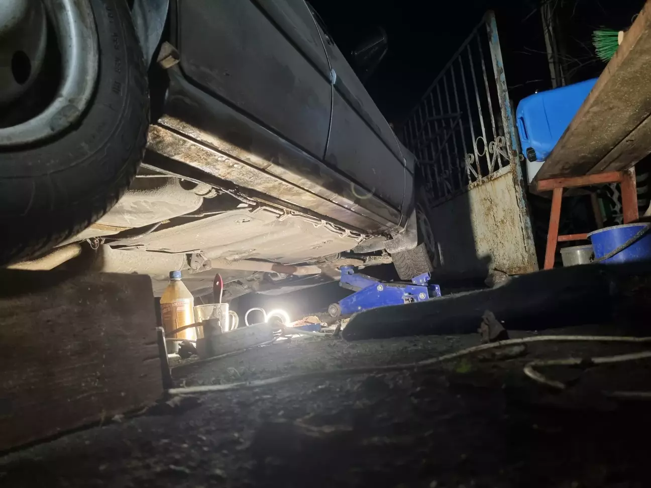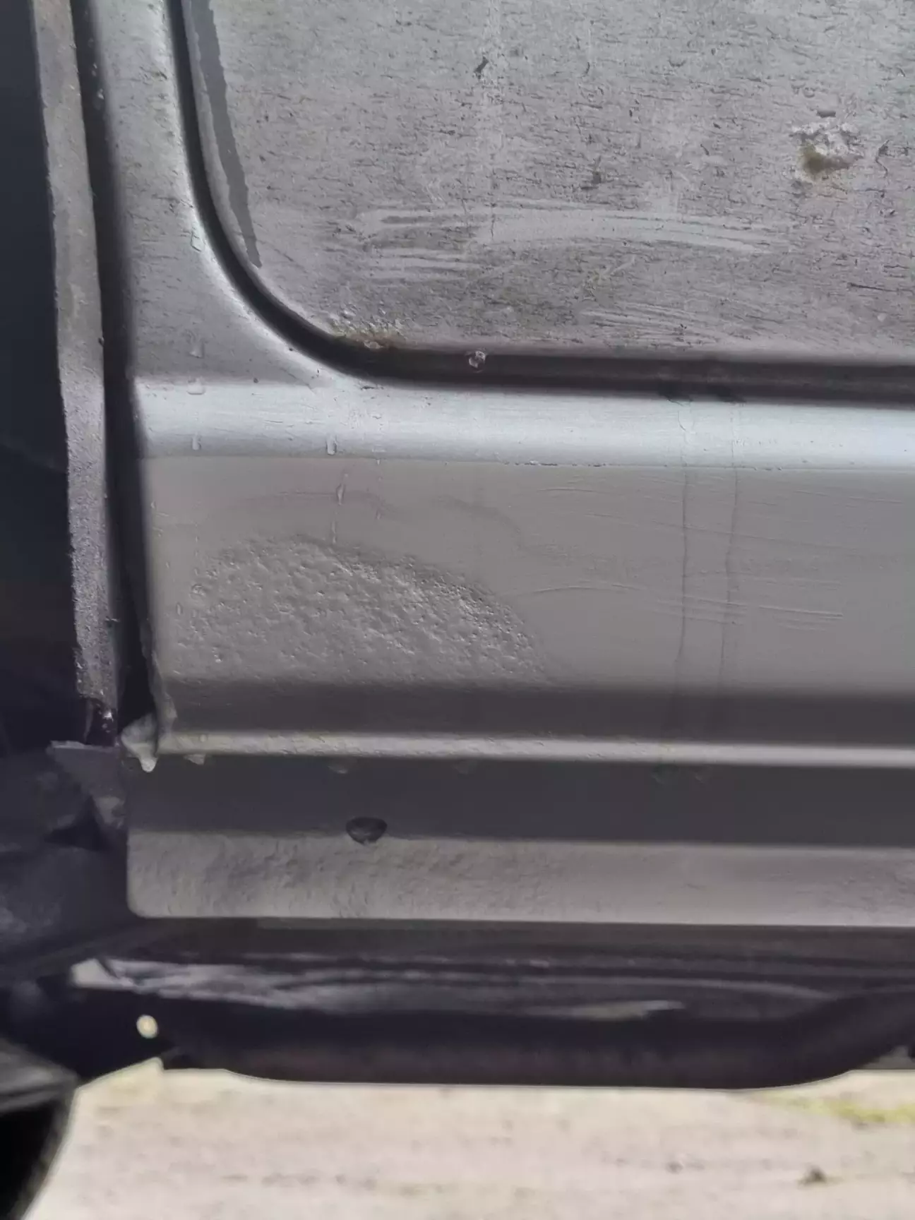 Пороги ще в заводській фарбі, були😅 Фарба сильно повздувалась, всюди була поверхнева корозія, адже авто ніхто не оброблював. Підставив дошки під колеса і зачистив пороги до металу, травив перетворювачем і зачищав ще. Потім наніс епоксидний ґрунт і на цьому поки завершив бо знов сира погода.