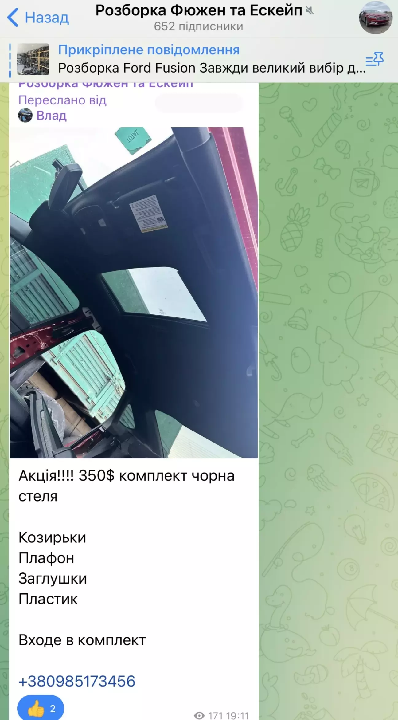 Але одного разу відкривши канал розбірки великими літерами бачу слово АКЦІЯ і суму 350$ за повний комплект. У цей момент мозок втрачає будь-який інстинкт і я вже пишу продавцю, уточнюючи деталі.