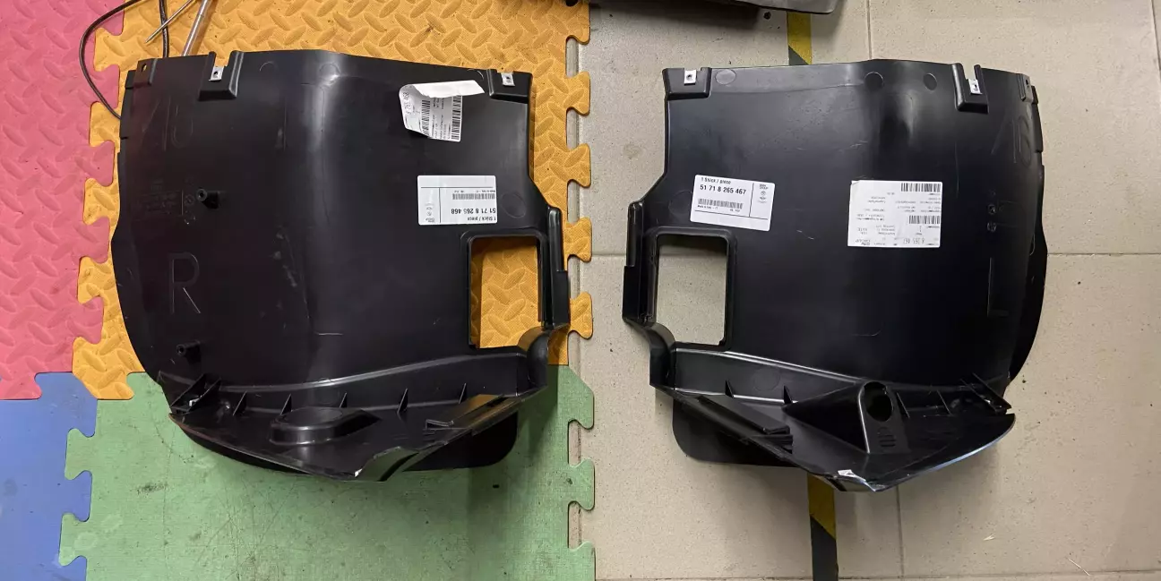 По подкрылкам, хоть я и писал, что с бампером купил подкрылки и воздуховоды под мтех2 бампер, но мои кривые руки в день установки бампера не прикрутили внизу подкрылок к бамперу и он благополучно стёрся об колесо😪, поэтому я психанул и купил два новых подкрылка. Как же приятно держать в руках новые оригинальные запчасти😁.