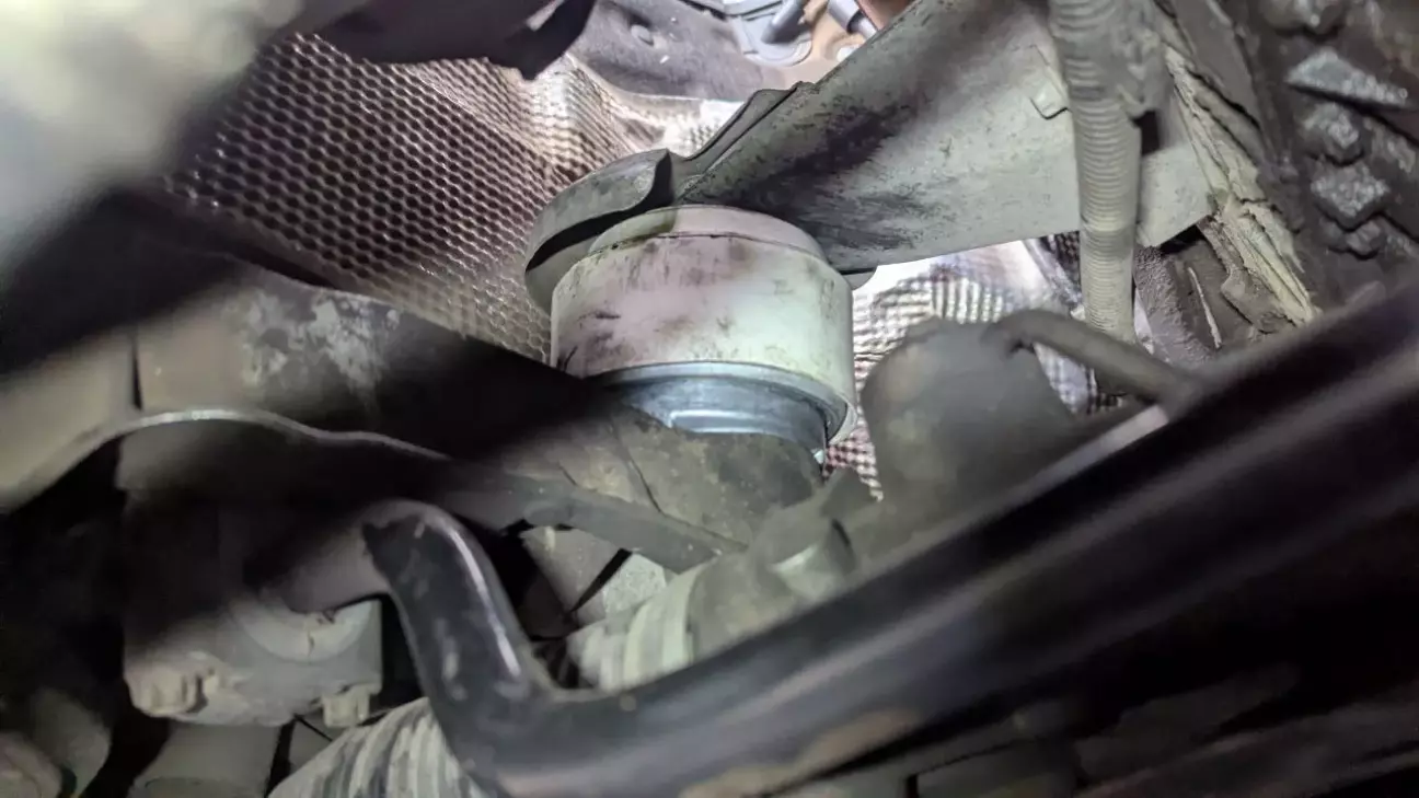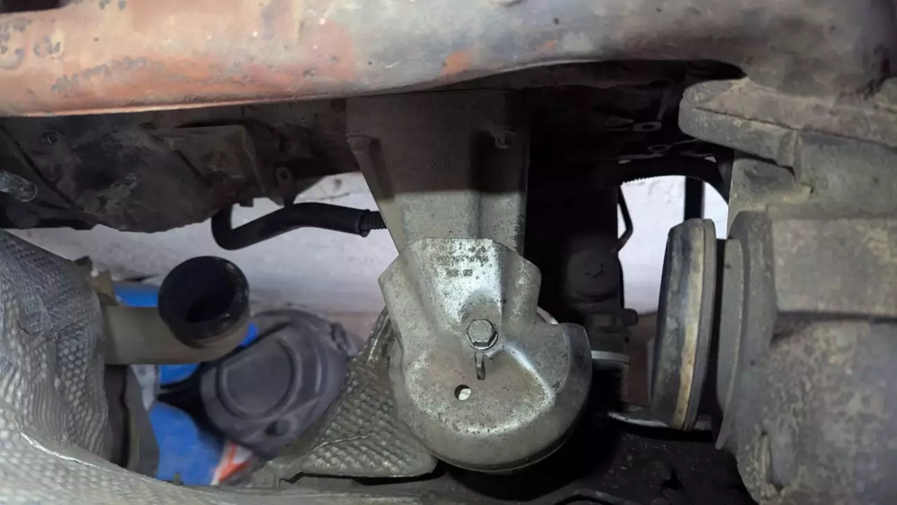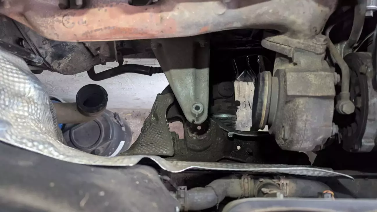 Далі поліз я міняти подушку ДВС зі сторони пасажира, ось тут вже прийшлось попотіти. Прийшлось зняти корпус воздушного фільтра і каталізатор чи сажовик (не знаю, в мене там просто пуста банка вже) який стоїть одразу за турбою. Знімається один хомут за турбіною та один знизу. Витягається через верх. Після цього доступ ну просто прекрасний. Взяв так само дощечку під піддон, піддомкратив двигун та замінив подушку. Знизу болт на 13, зверху на 16. Знімав каталік, бо в мене верхній болт уперся в його корпус і не хотів далі крутитись, може так тільки в мене.