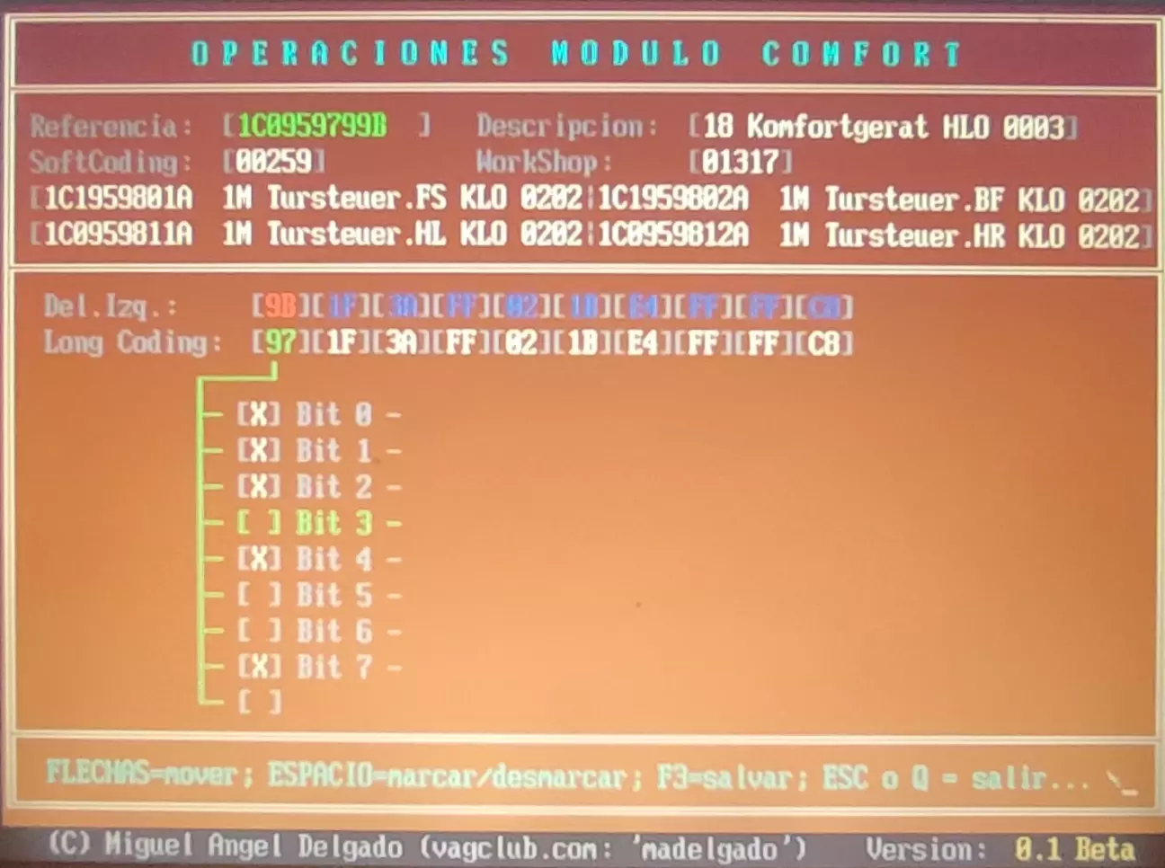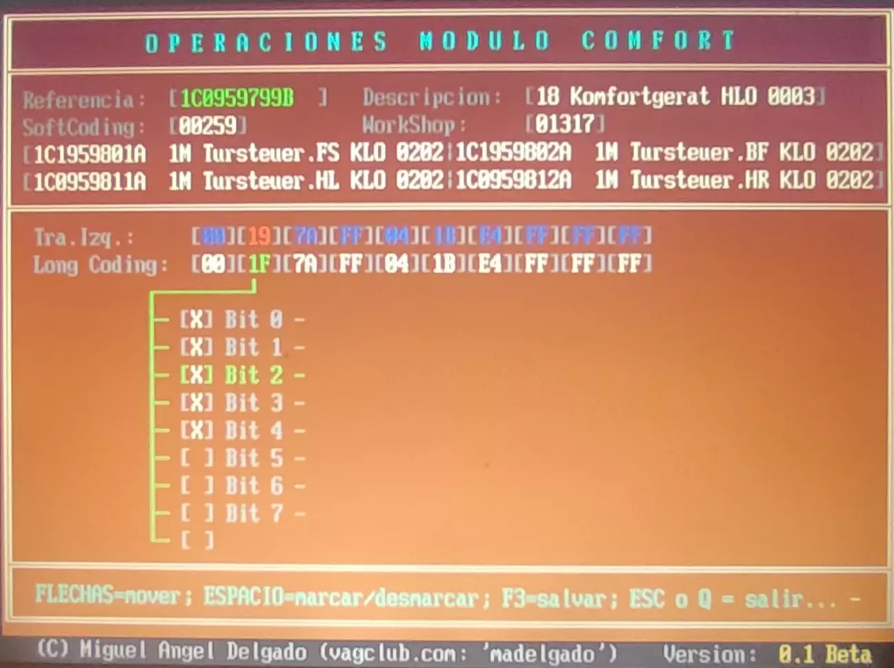 Стрілкою вправо листаємо на байт 1 (відрахунок починається з нуля) та вибираємо біти 1 та 2 пробілом, зберегти - F3. Виходимо клавішею Esc та робимо аналогічно для правих задніх дверей.