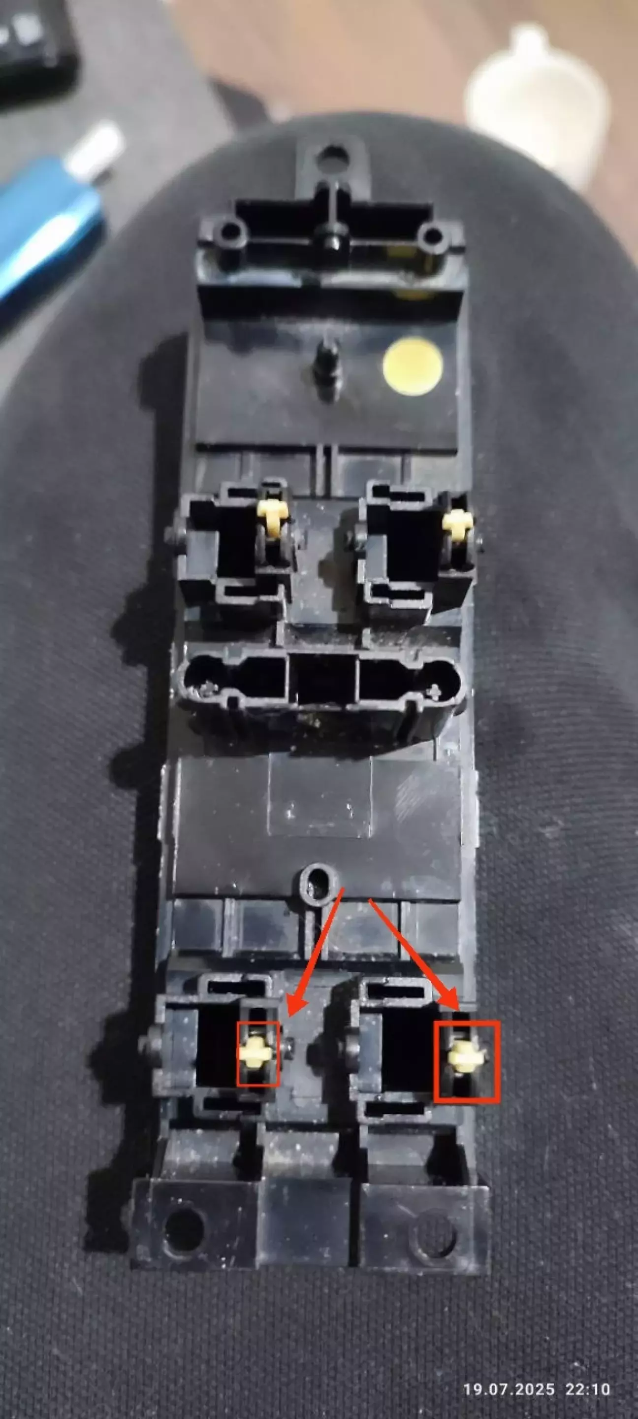 До речі, якщо у тебе є проблема, що кнопка закусує, можна оці натискачі легенько шліфонути наждачкою і саму шахту, де вони ходять, теж, маленьким надфілем. Пояснюється це тим, що за 20+ років є виробка на деталях. Можна звичайно зробити простіше - просто штовхачі розвернути іншою стороною)