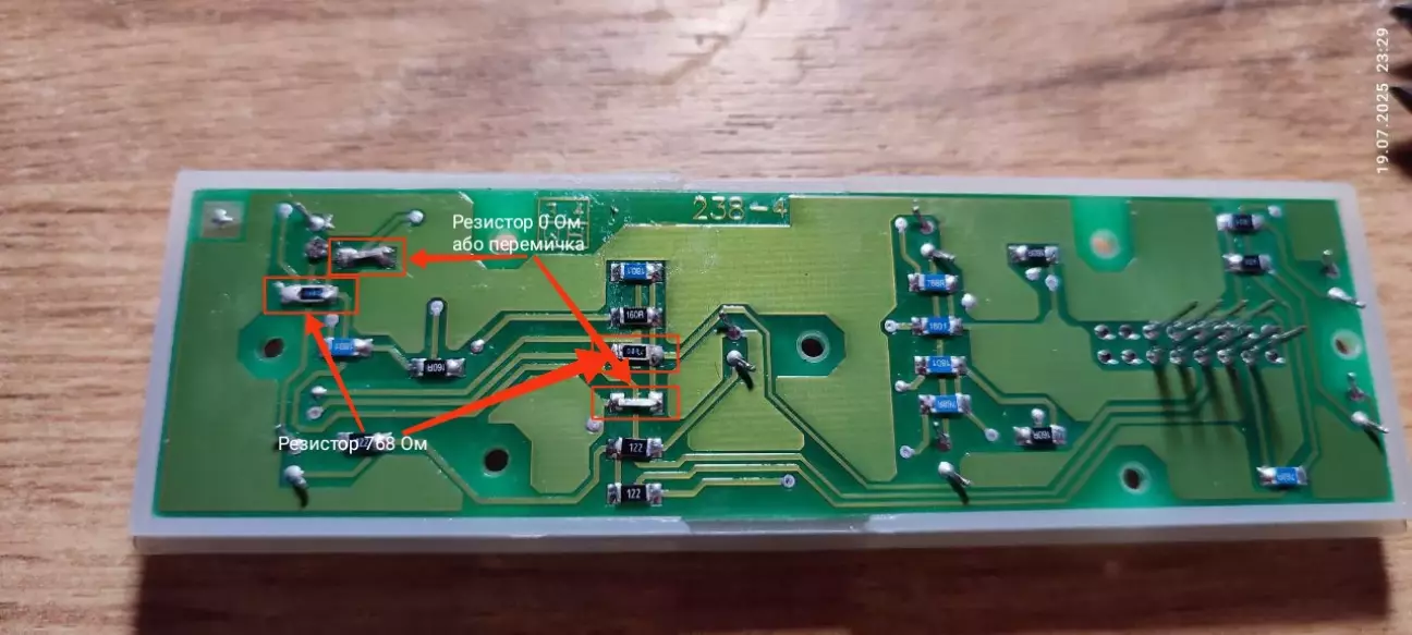 Після цього приступаємо до пайки деталей. Потрібно випаяти два SMD резистора з донора, номіналом 768 Ом, чорного кольору та впаяти їх на нашу плату. Також потрібно впаяти два резистори 0 Ом або ж просто перемичку на плату.