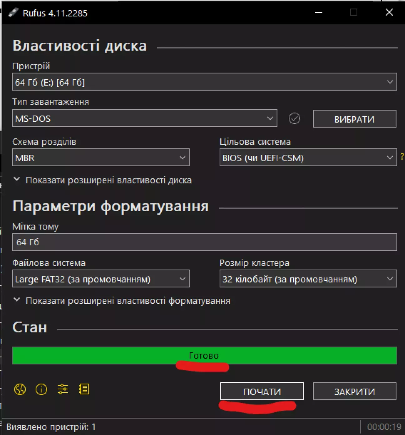 Після того, як запис завершиться, статус бар стане зеленим та буде напис Готово. Натискай кнопку Закрити. Програма закриється.