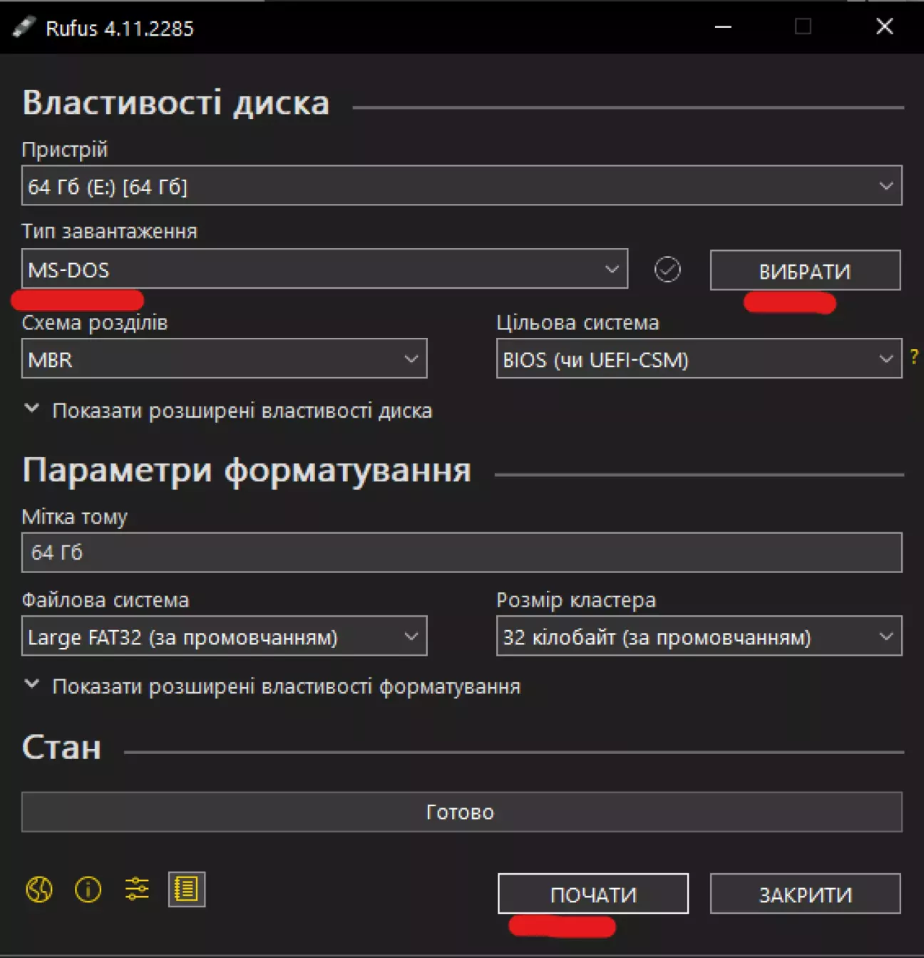 Відкриваємо скачаний файл, натискаємо поле, яке підкреслено, вибираємо з списку MS-DOS та тиснемо кнопку Почати.